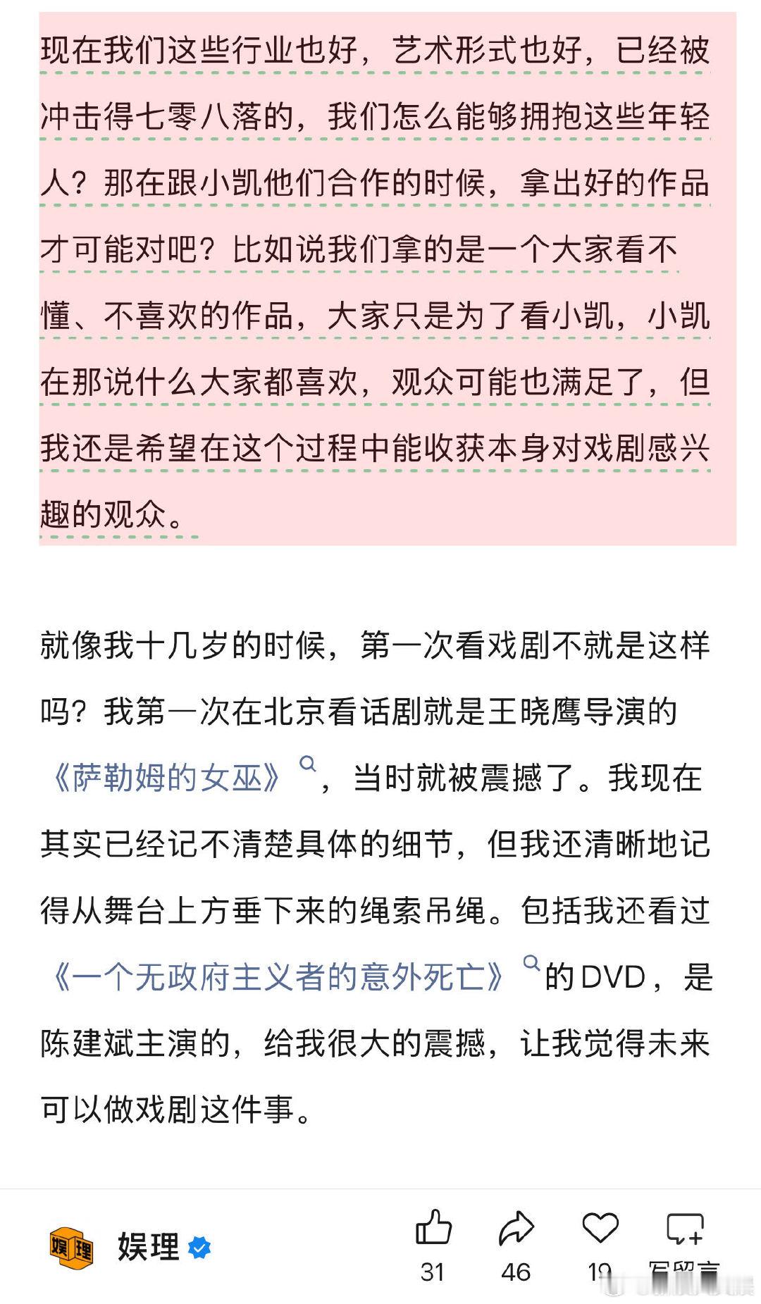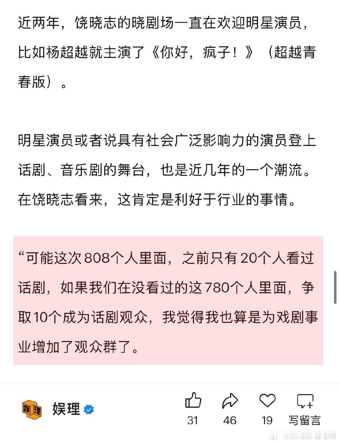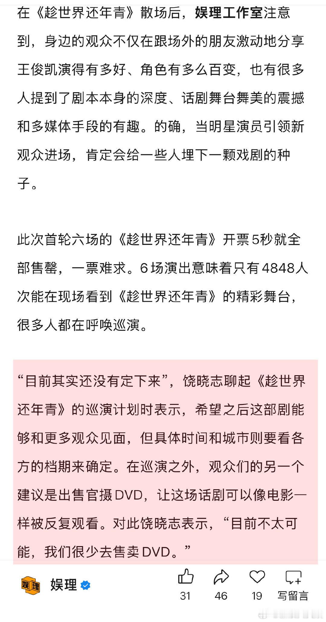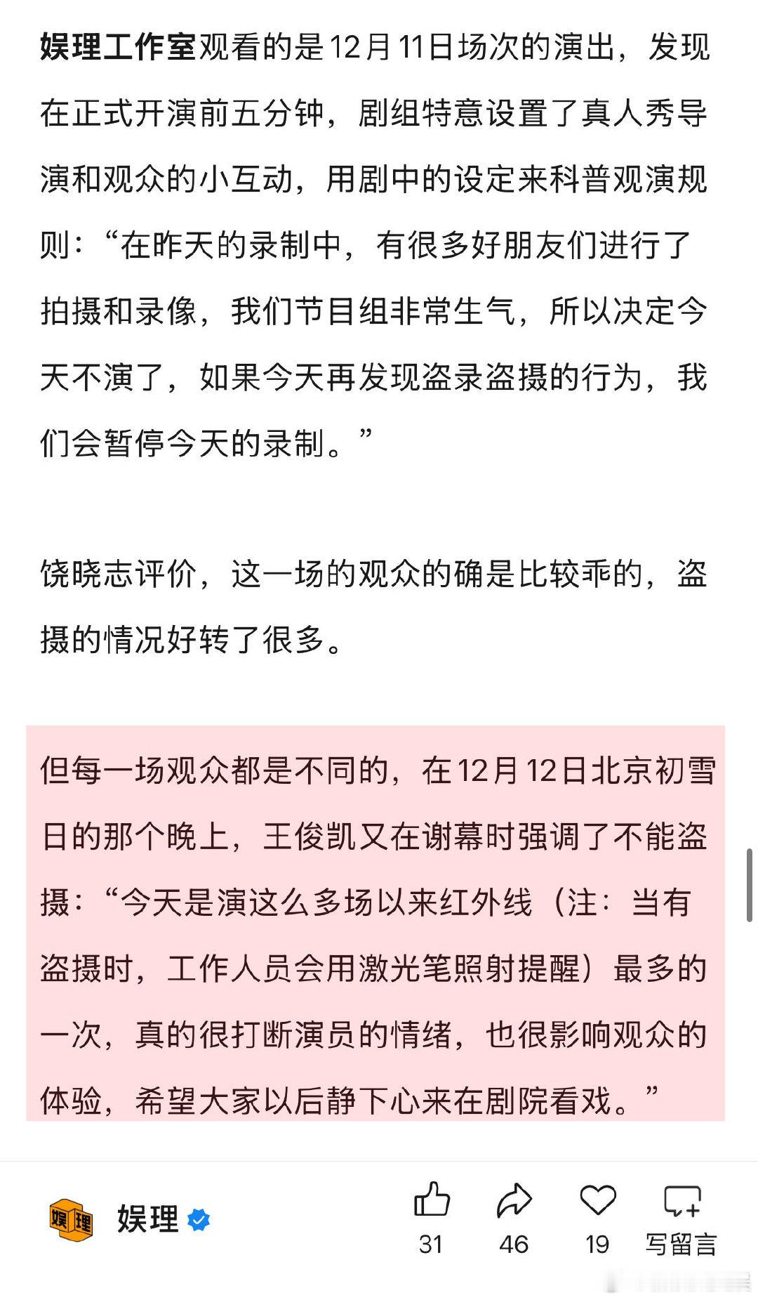 饶晓志说王俊凯演戏没有杂念 饶晓志说王俊凯背词特别快 王俊凯舞台首秀,每场又仅能进入808个观众,部分首次接触话剧演出的观众不知道剧场礼仪、忍不住想举起相机记录并分享,也是人之常情。明星演员登上剧场舞台,总会带来一批新的观众,此时,向新观众科普观演文明、让他们爱上话剧艺术,就是主创们需要努力的方向。娱理独家↓