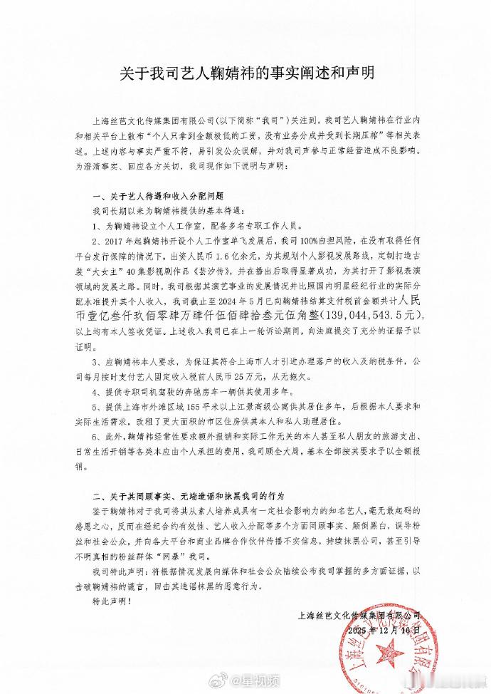 丝芭回应鞠婧祎收入争议丝芭称已支付鞠婧祎超1.39亿 发布【关于我司艺人鞠婧祎的事实阐述和声明】,上海丝芭文化传媒集团有限公司(以下简称“我司”)关注到,我司艺人鞠婧祎在行业内和相关平台上散布“个人只拿到金额极低的工资,没有业务分成并受到长期压榨”等相关表述。上述内容与事实严重不符,易引发公众误解,并对我司声誉与正常经营造成不良影响。为澄清事实、回应各方关切,我司现作如下说明与声明。