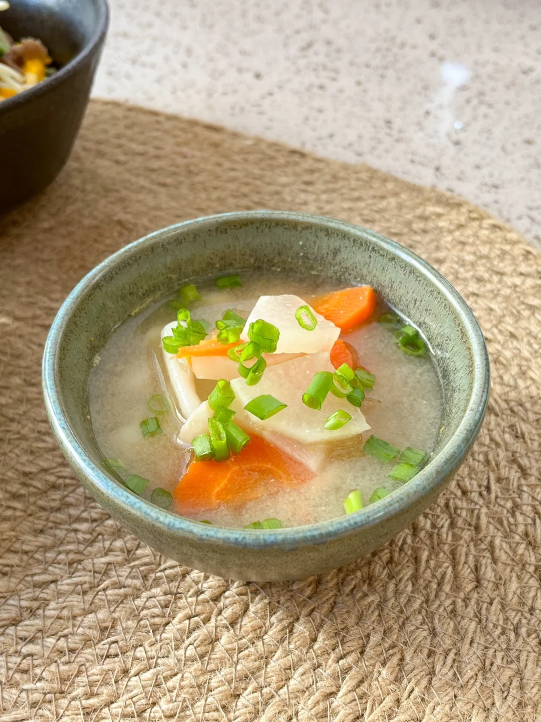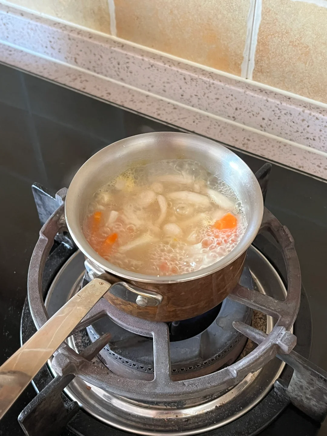 白萝卜、胡萝卜和海鲜菇,就这三样蔬菜就能煮出好喝的味增汤!蔬菜加水煮10分钟,用滤网加半勺味增酱,煮1分钟就关火。白萝卜太适合煮汤了,汤底都是鲜甜味儿的!