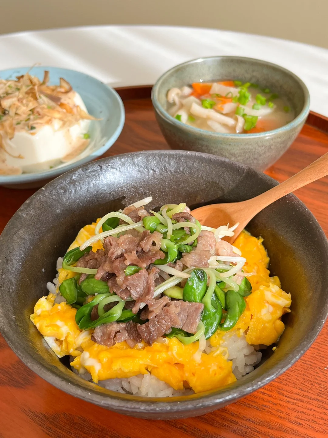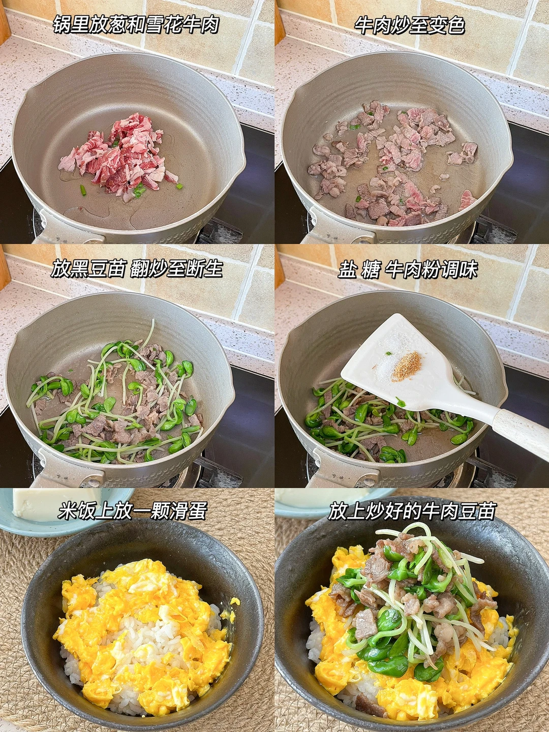 黑豆苗的口感更接近豆芽,也更有青菜味儿,雪花牛肉炒出油脂再放豆苗,这样就能吸收牛油的香味。再打一颗鸡蛋,小火滑炒至八分熟,拌着饭吃可满足啦