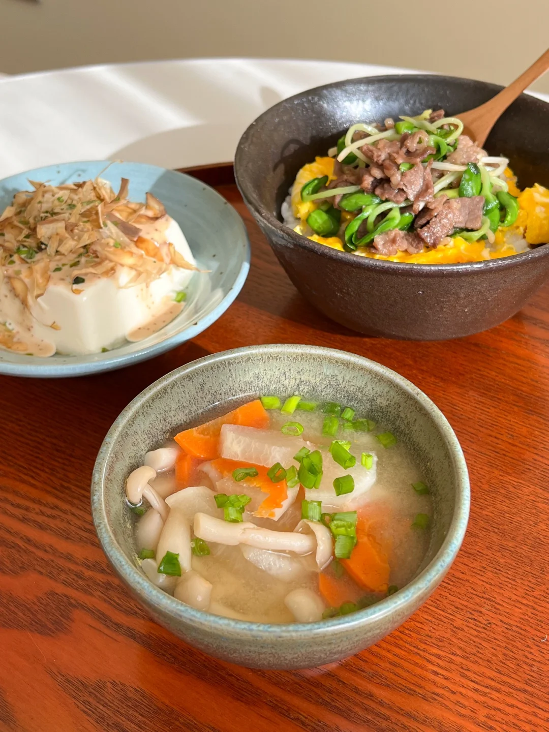 “平日里一个人吃饭最方便的就是盖饭啦,再加碗简单的清汤,真的nice✌️!”