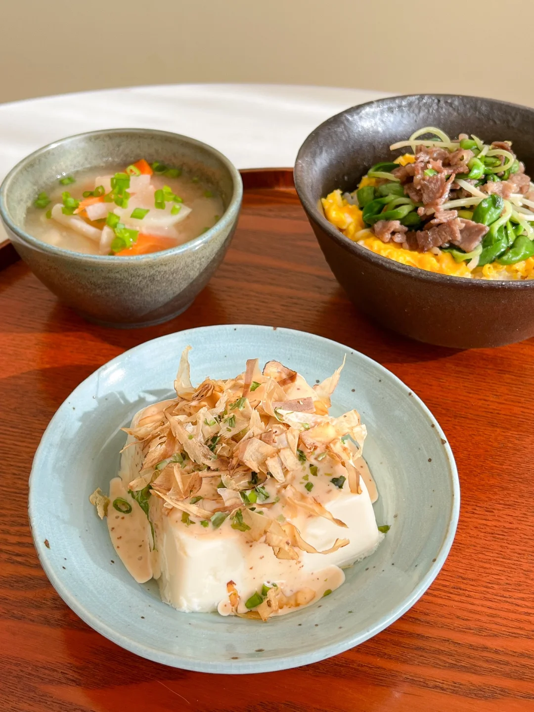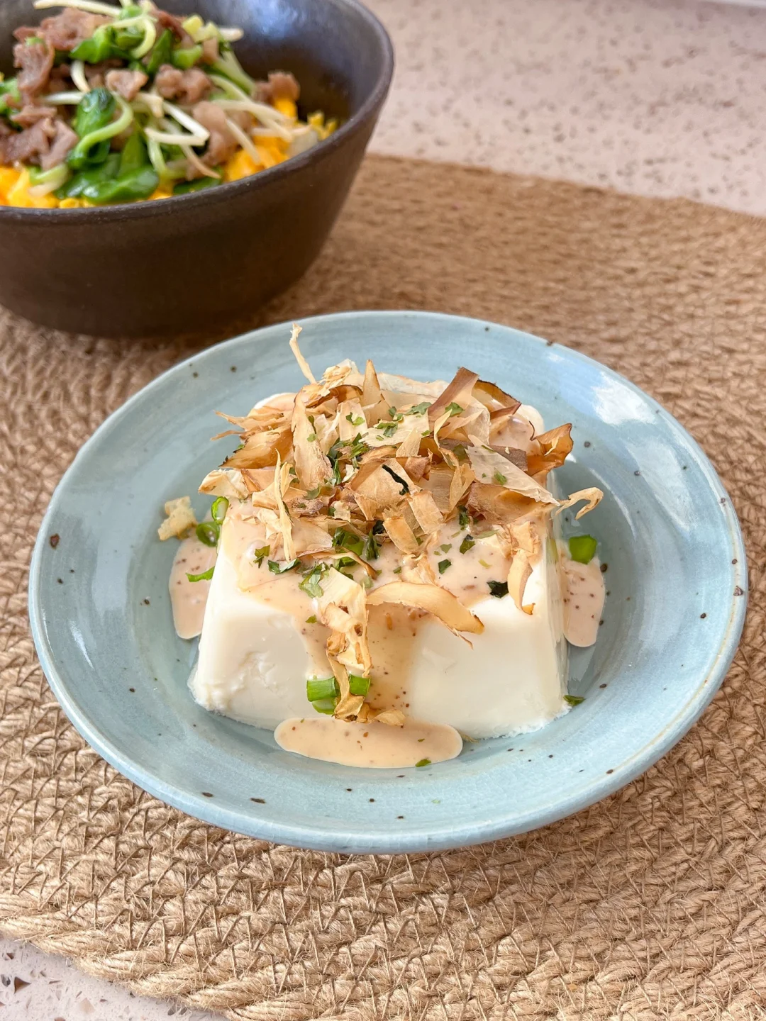 每次去超市都要补货的布丁豆腐,一小盒我一顿正好吃完。淋一点烘培芝麻酱、小葱和木鱼花,就是一道低卡又好吃的小菜~