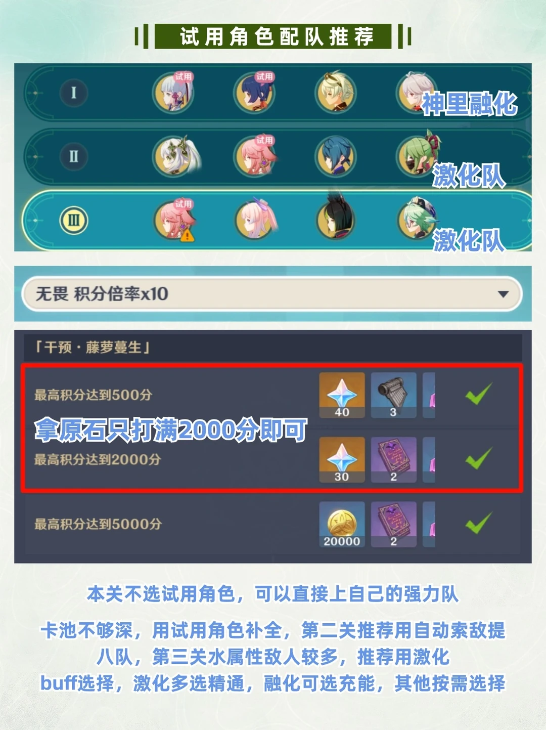 原神限时活动导能原盘DAY4:「富集·高能元素」开启 推荐使用自己的强力队~ 推荐配队: 1⃣️神里融化:神里绫华+香菱+班尼特+万叶 2⃣️提八队:八重神子+心海+提纳里+砂糖 3⃣️激化队:纳西妲+八重神子+行秋+久岐忍 ✨推荐效应器: 激化队选择精通 融化队选择充能