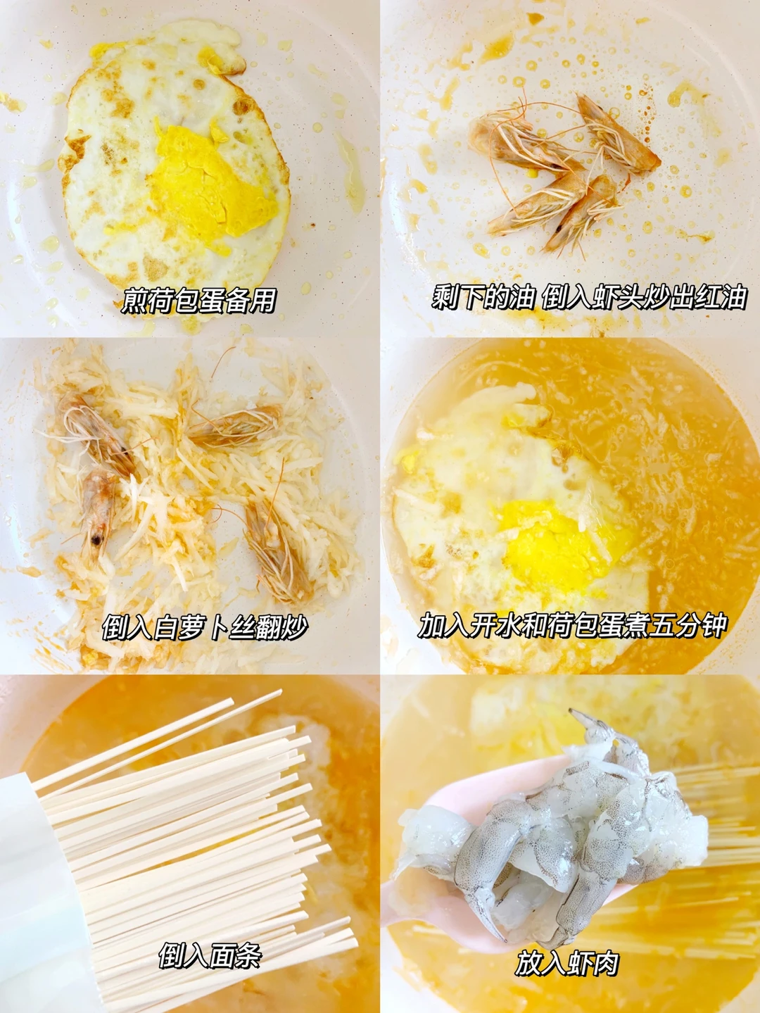 2⃣️剩下的油,倒入虾头炒出红油,放入萝卜丝翻炒