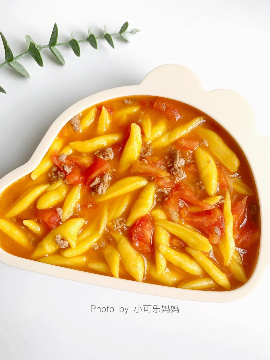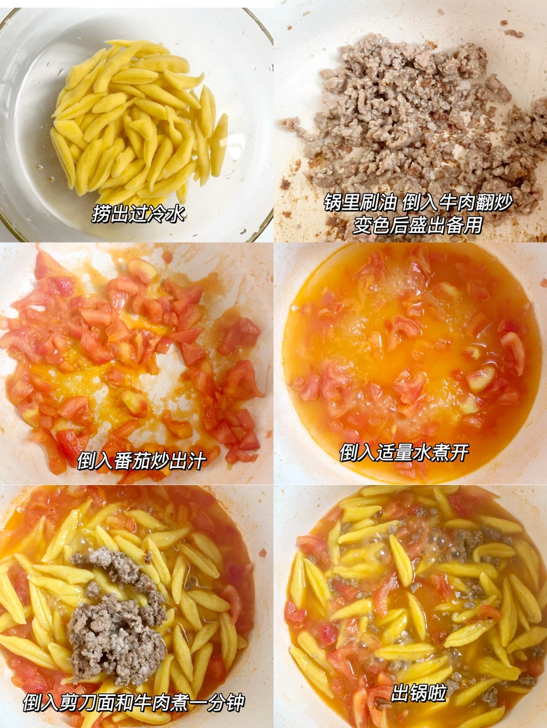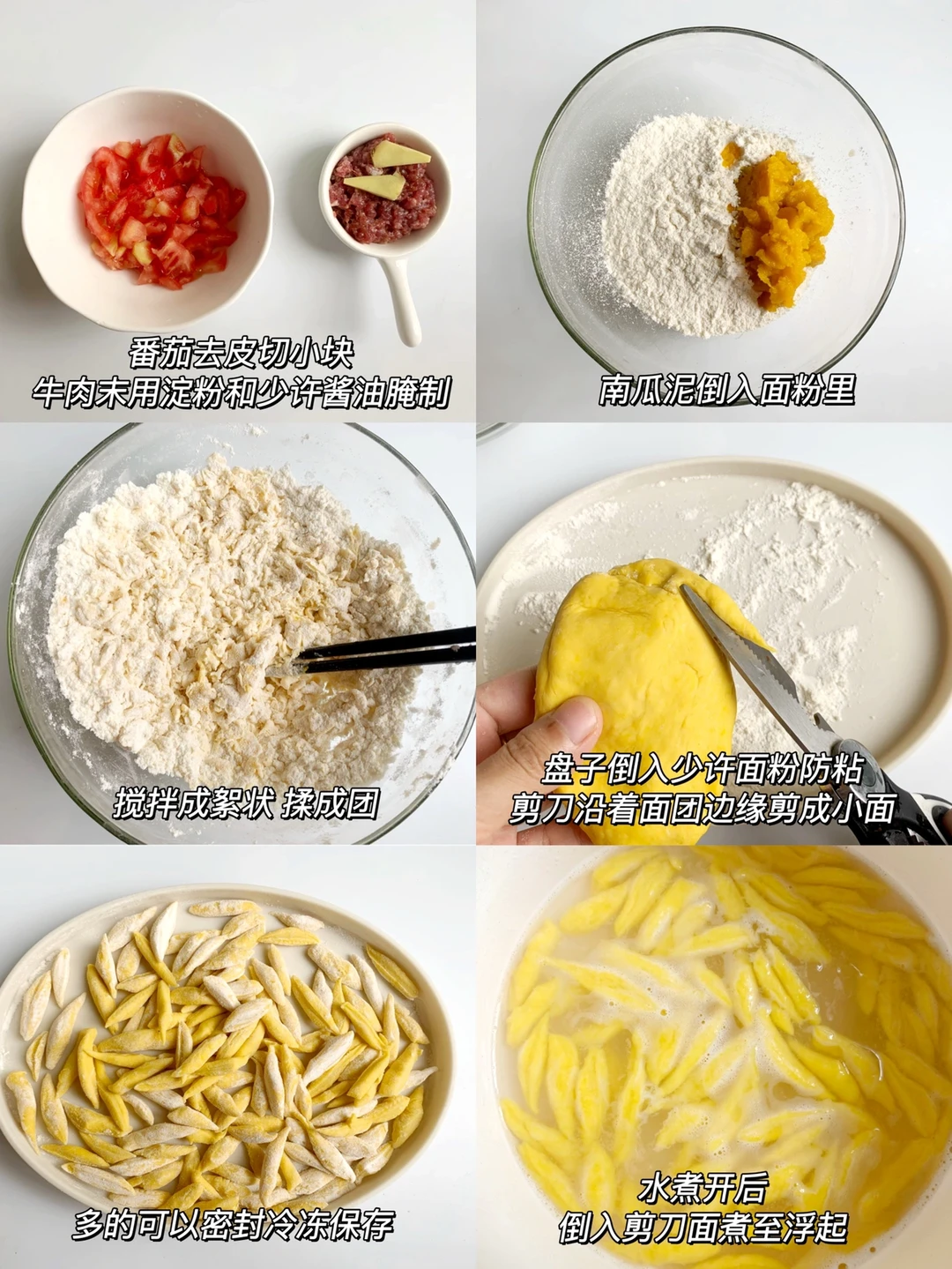 今天给大家分享一道营养好消化的南瓜剪刀面,搭配番茄牛肉汤,酸甜开胃,宝宝更爱吃,补铁补锌,快给宝宝安排上吧[赞R] . 🌟食材 面粉100克 南瓜泥50克 牛肉 番茄 . 🌟做法 1⃣️番茄去皮切块,牛肉用淀粉和少许酱油腌制 2⃣️面粉里倒入南瓜泥,搅拌成絮状,揉成团,用剪刀沿着面团边缘剪成小面 3⃣️锅里水开后倒入面条煮至浮起,捞出过凉水 4⃣️锅里刷油倒入牛肉翻炒至变色盛出,倒入番茄去炒出汁,加入少许水煮加入剪刀面和牛肉煮一分钟即可(加点盐更好吃)