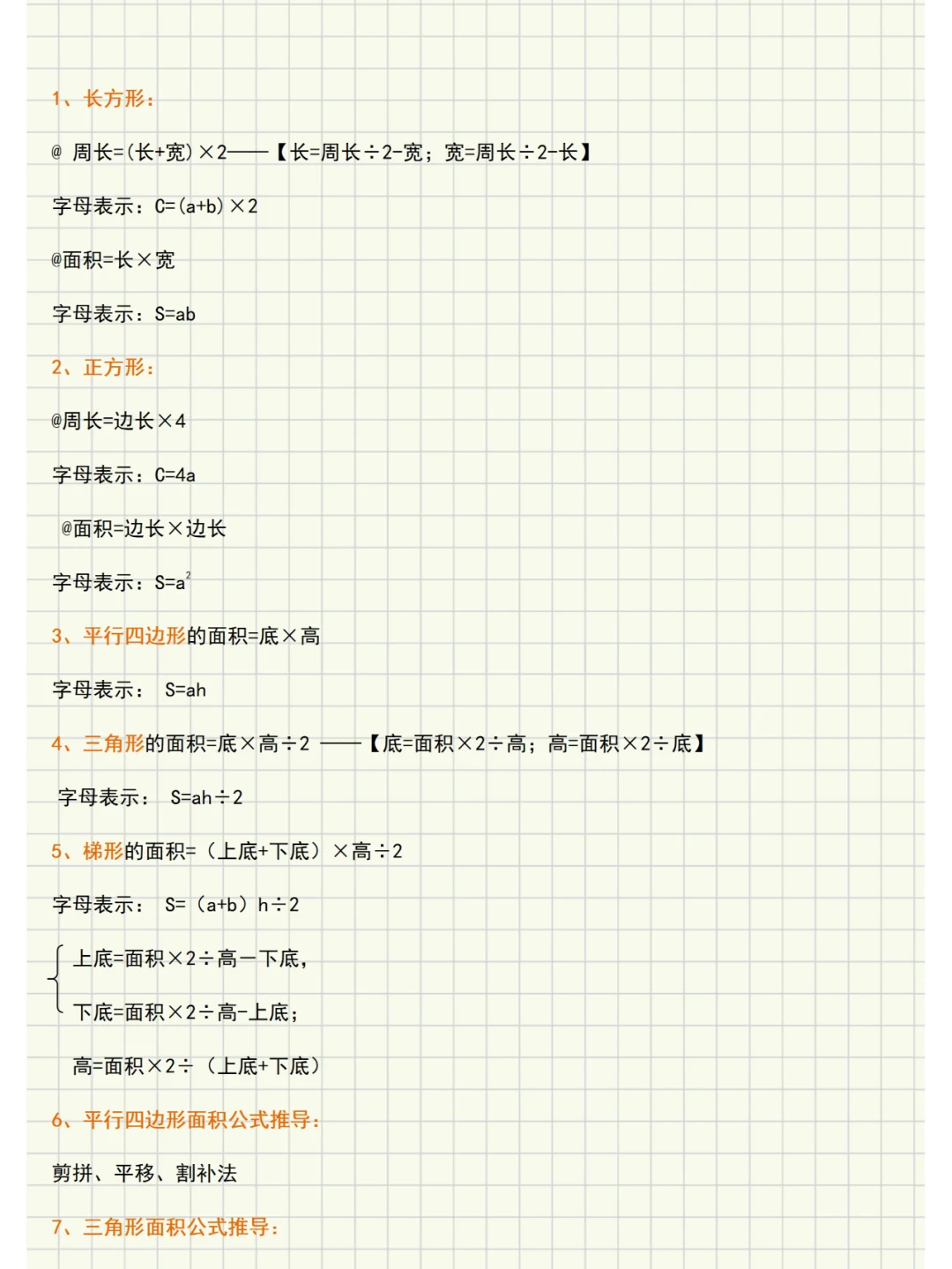 👉第六单元属于几何模块,难点是组合图形的面积计算,方法是:先用分割、拼补的方法,将组合图形转化成已学的简单图形,分别算出面积;再通过加、减求得。
