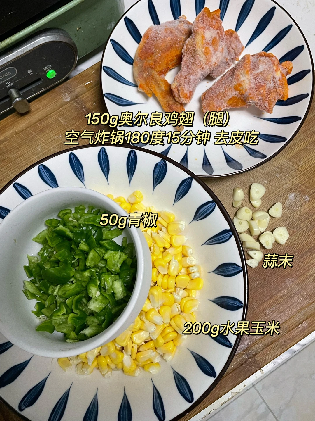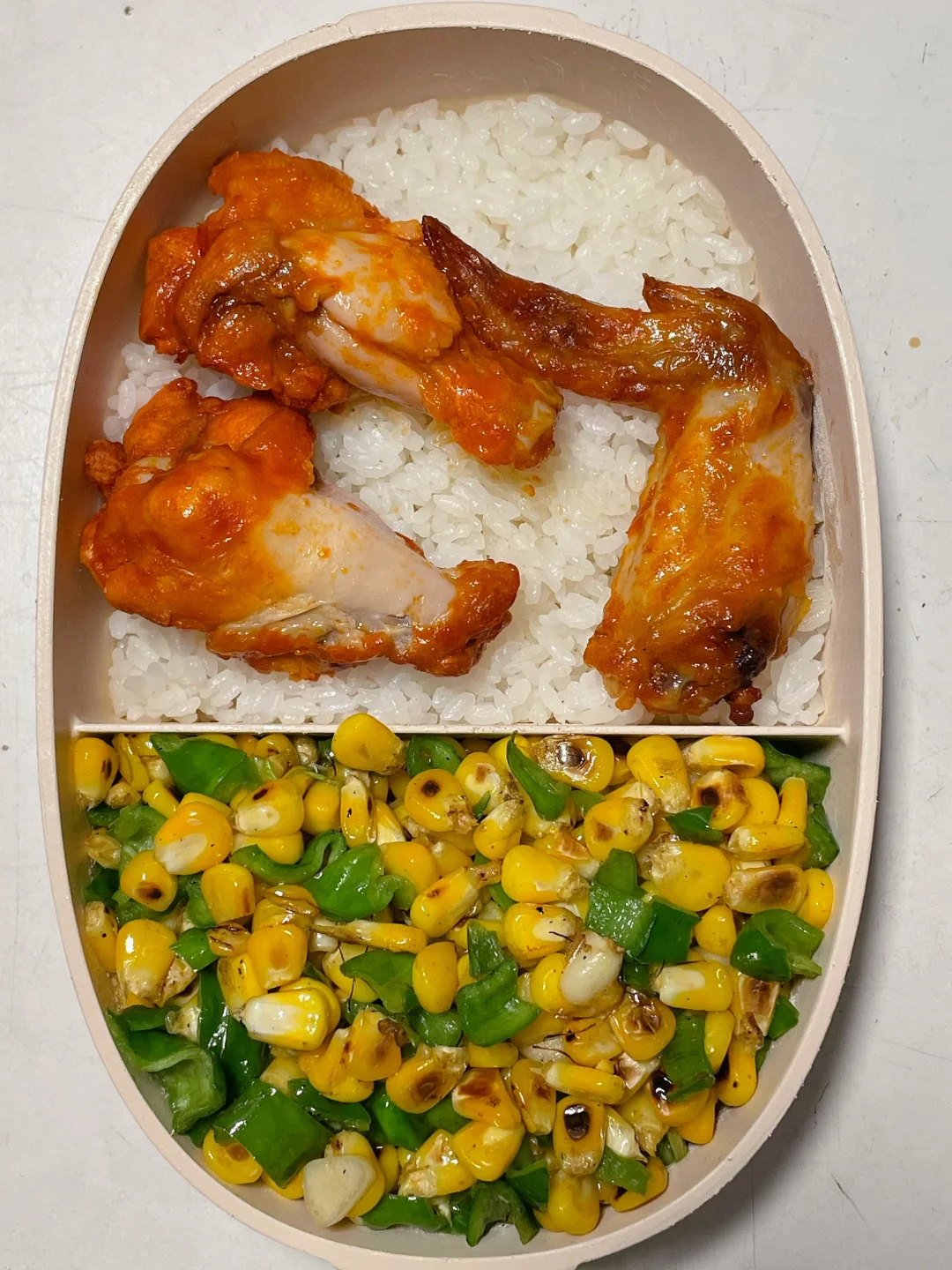 午 米饭+青椒炒玉米+奥尔良烤鸡腿(翅)