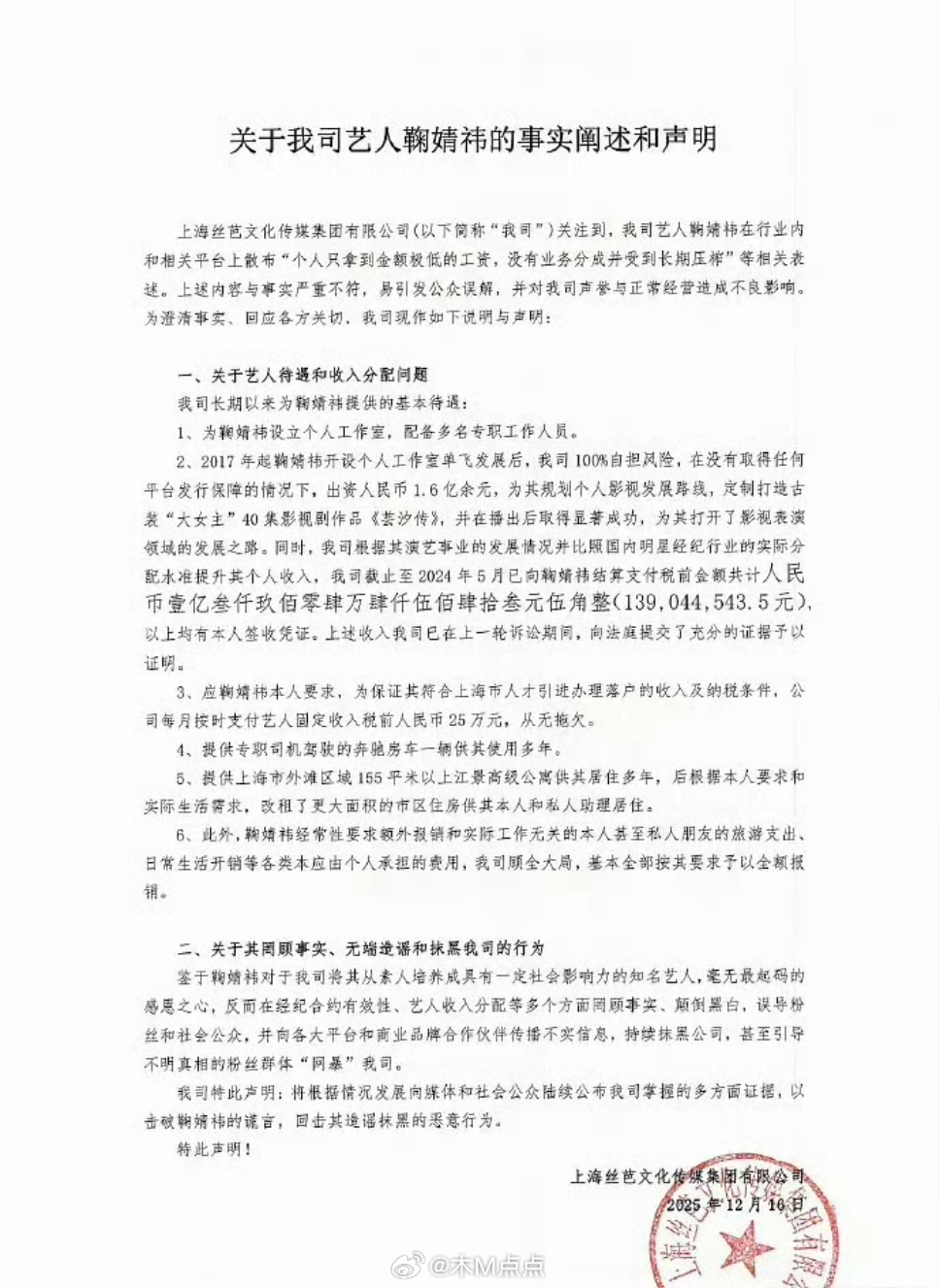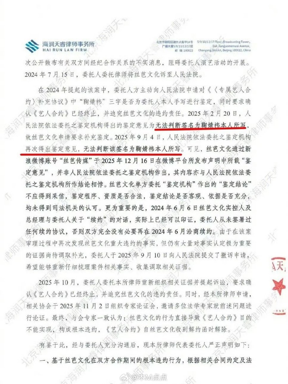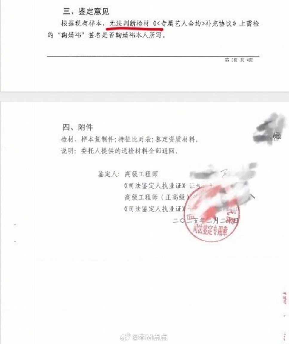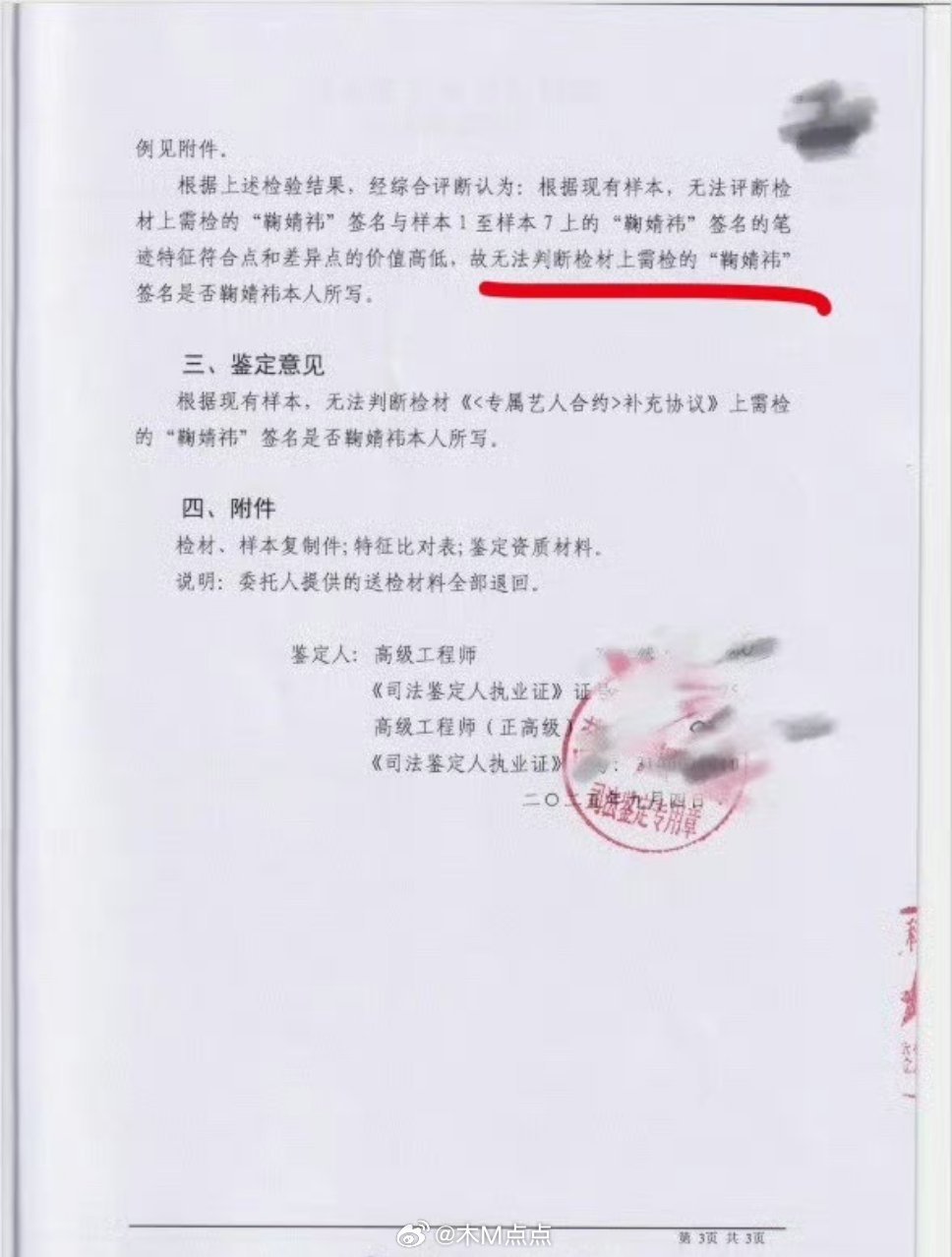 鞠婧祎方再发声明,也贴了鉴定报告:法院鉴定机构“无法判断该签名为鞠婧祎本人所写”…现在是一点情面也不讲了吗? 丝芭好阴啊,直接爆税前收入!暗示查她是不是按这个金额申报纳税的…有戏看了,真金不怕火炼~总结一下,双方都各抒一词都说自己有证据,丝芭说签名是真的,鞠婧祎方说是公司伪造的,最后怎么样也只有上法院说了而且直接曝收入,看来彻底撕破脸了~这么看🍊比我们想象中的红,这待遇 明星确实比一般打工人和二般打工人挣得多。是社会问题行业问题 鞠婧祎方艾特丝芭,丝芭回应鞠婧祎,丝芭称已支付鞠婧祎超1.39亿