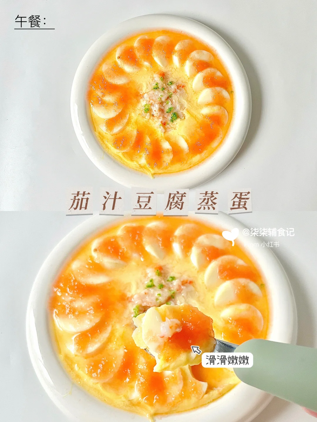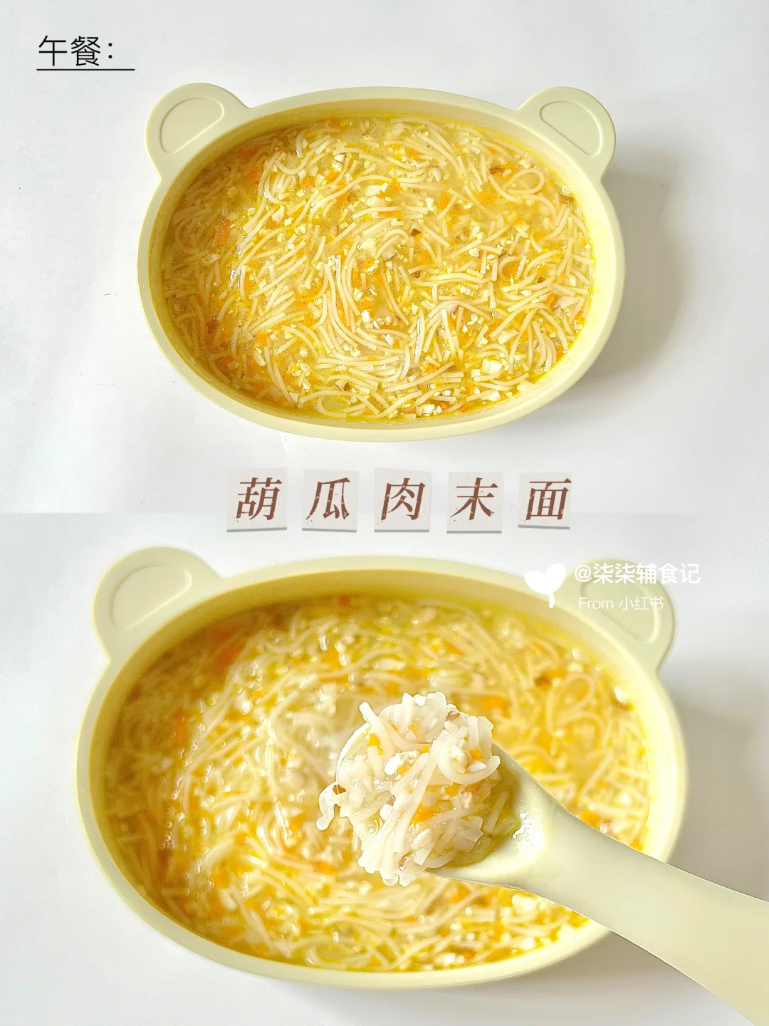 👧:10个月➕22天 ⏰:午餐11:30 🥣:茄汁豆腐蒸蛋、葫瓜肉末面 🍽️:水果:圣女果 ⏰:晚餐18:00 🥣:玉米胡萝卜小米糊 午餐茄汁豆腐蒸蛋和葫瓜肉末面~这个豆腐蒸蛋也太好吃了吧~柒柒吃了2/3,根本停不下来,怕她吃不下面条就赶紧收起来了哈哈… 晚餐玉米胡萝卜小米糊,中午吃太丰盛啦!晚餐就随便吃吃吧~米糊也好消化😁 ⚠️食材分量根据宝宝的食量添加。 ⚠️食材大小根据宝宝的咀嚼能力处理。