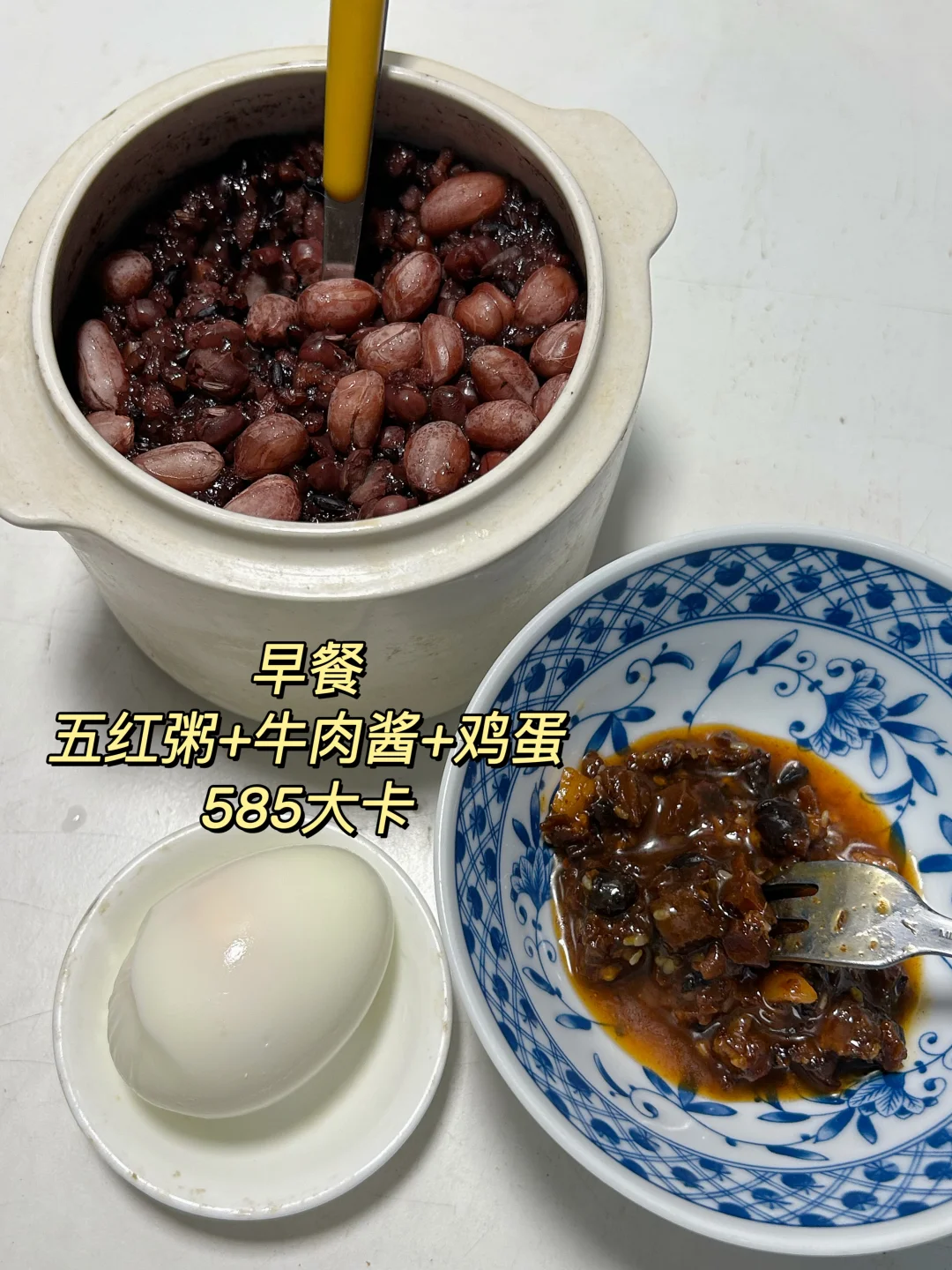 早 五红粥+鸡蛋+牛肉酱