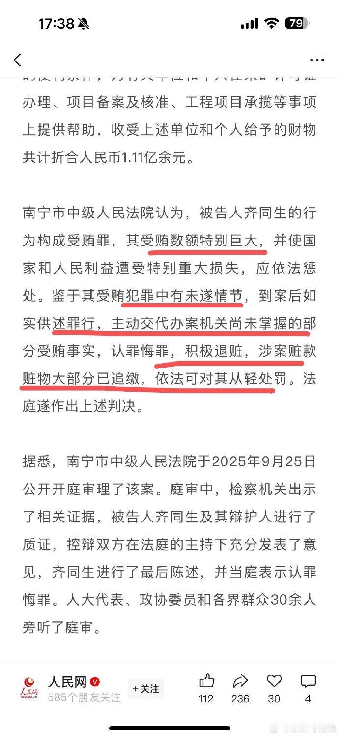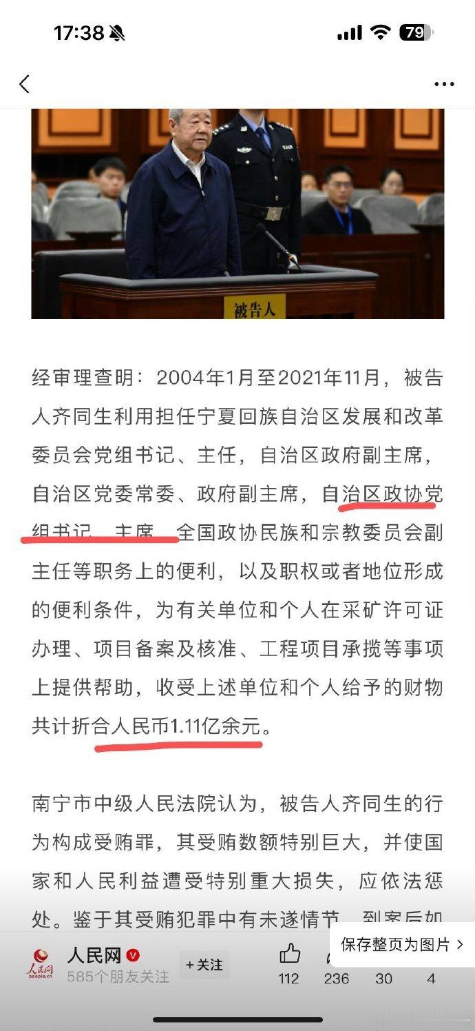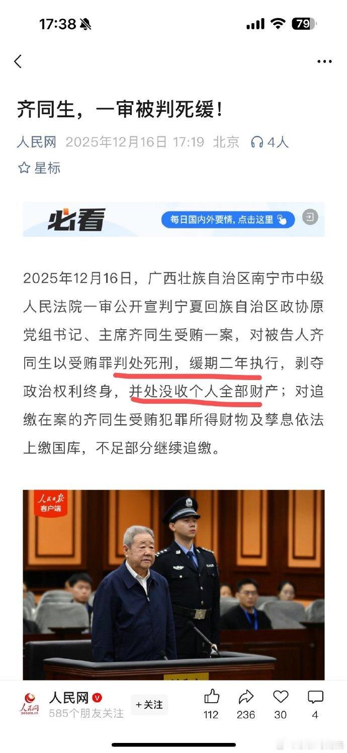 齐同生一审死缓【齐同生受贿1.11亿余元】部级贪官宁夏回族自治区政协原党组书记、主席齐同生自2004年1月至2021年11月累计受贿1.11亿余元被判处死刑,缓期二年执行。不到18年便实现了一个多“小目标”,成为“先富一族”,速度够快。齐同生还是一名“边腐边升”的典型代表。他按开始受贿时是正厅级干部,受贿一年后成为副省级高官,受贿9年后成为正省级高官。要知道,正厅级晋级副省级、副省级晋级正省级,那是多么难啊。已经73周岁的齐同生,余生就只能在秦城监狱度过了。