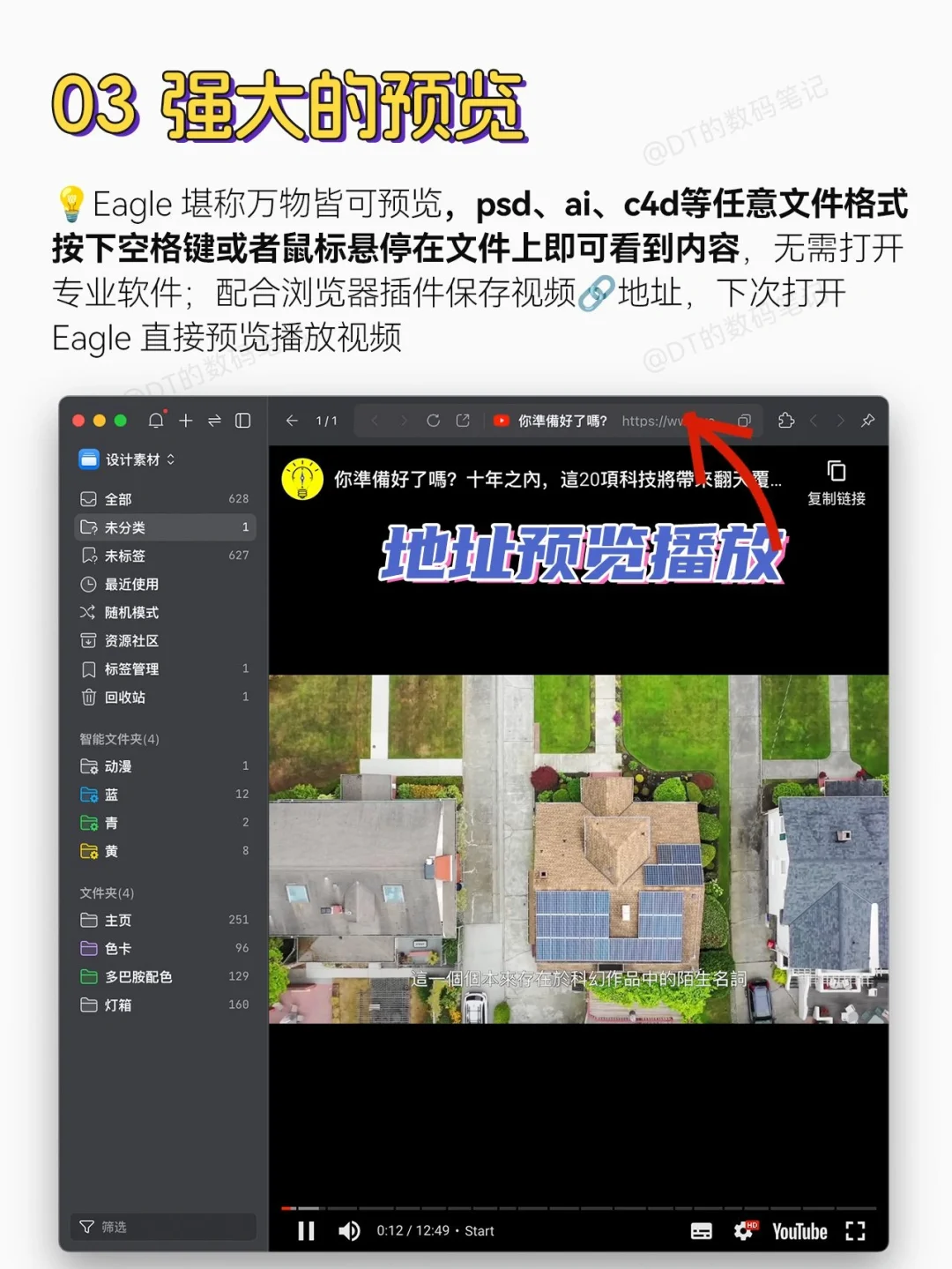 Eagle 堪称万物皆可预览,任意文件格式按下空格键或者鼠标悬停在文件上即可看到内容,无需打开专业软件,即使是psd、ai、c4d的文件也不在话下;配合浏览器插件保存视频或其他素材🔗,下次打开Eagle 直接预览播放视频
