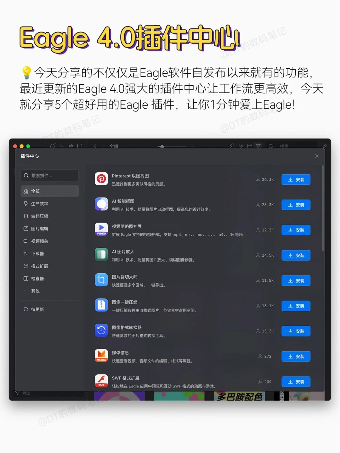 今天分享的不仅仅是Eagle软件自发布以来就有的功能,最近更新的Eagle 4.0强大的插件中心让工作流更高效,今天就分享5个超好用的Eagle 插件,让你1分钟爱上它!
