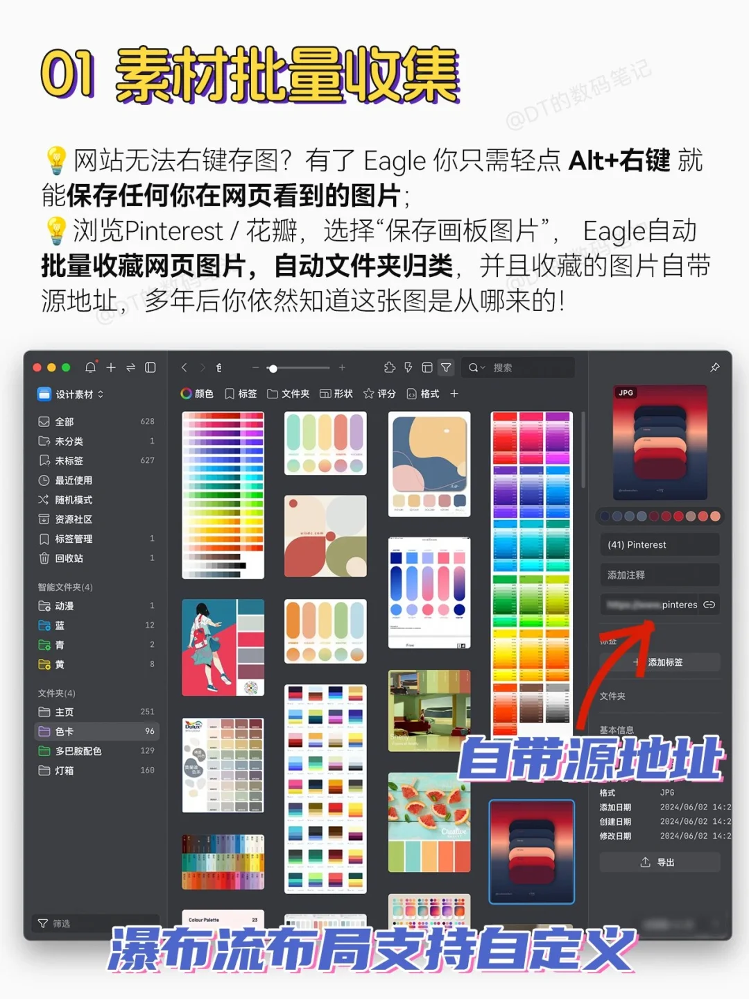 网站无法右键存图?有了 Eagle 你只需轻点 Alt+右键 就能保存任何你在网页看到的图片;浏览Pinterest / 花瓣,选择“保存画板图片”, Eagle自动批量收藏网页图片,自动文件夹归类,并且收藏的图片自带源地址,多年后你依然知道这张图是从哪来的!