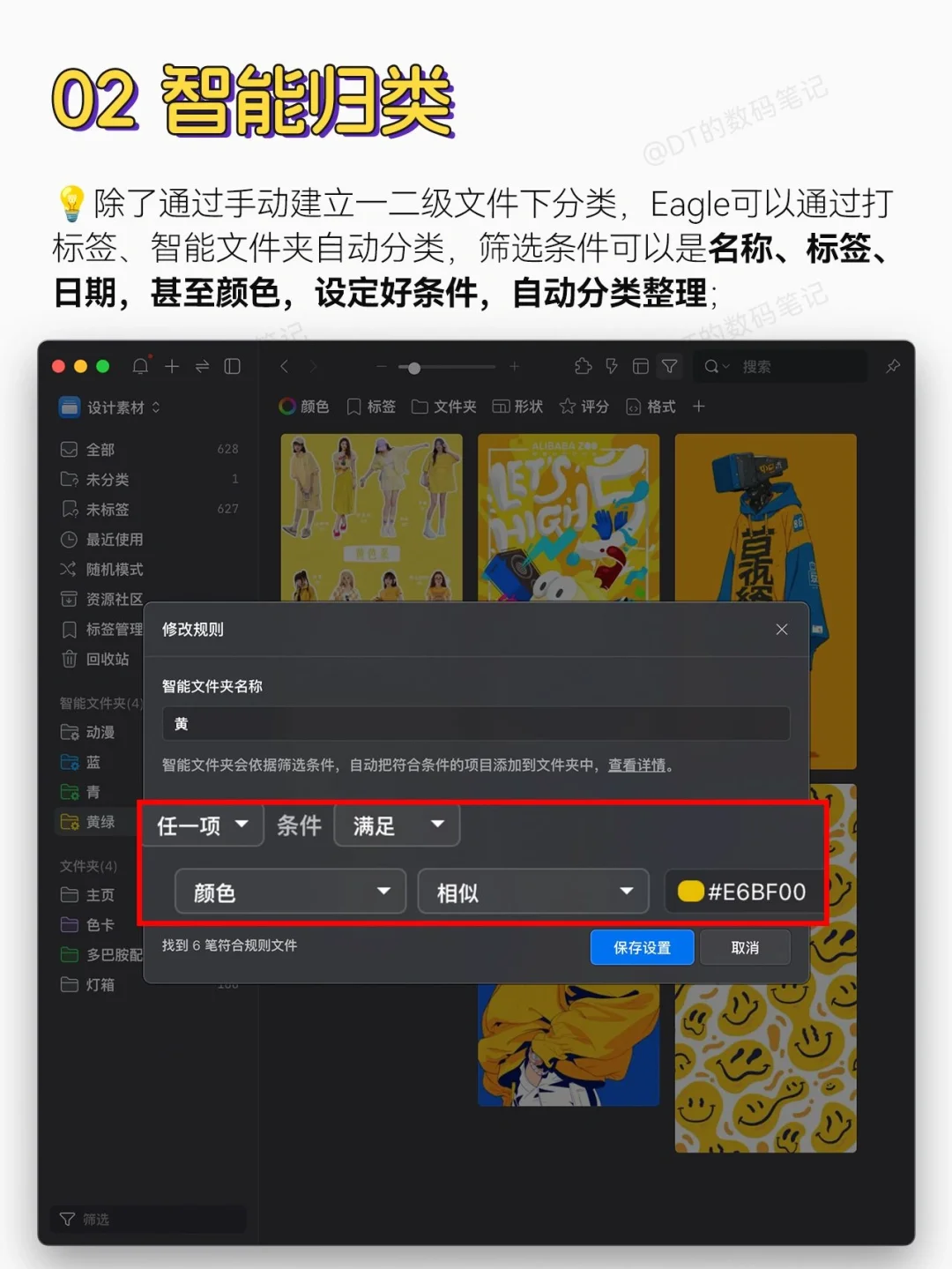除了通过手动建立一二级文件下分类,Eagle可以通过打标签、智能文件夹自动分类,筛选条件可以是名称、标签、日期,甚至颜色,设定好条件,自动分类整理