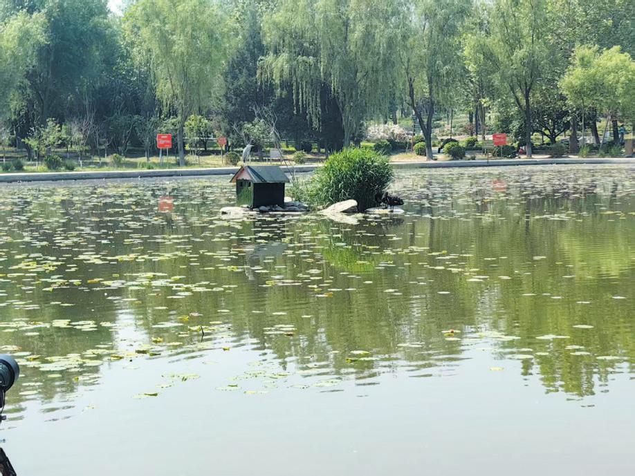 据他介绍,2022年,公园对湖进行清理,栽植了荷花,建立了两个水位线,并以多个石墩为基础建了小湖心岛,设置了植物和黑色房子,为水鸟栖息使用。“这些草和房子更多起到装饰作用,春秋两季,公园会在湖中放水,此时水位会淹没石墩,只露出湖心岛的青草和房子。”他说,湖心岛和房子其实不是鸭子的窝,鸭子平时在水边的草坪上过夜。
