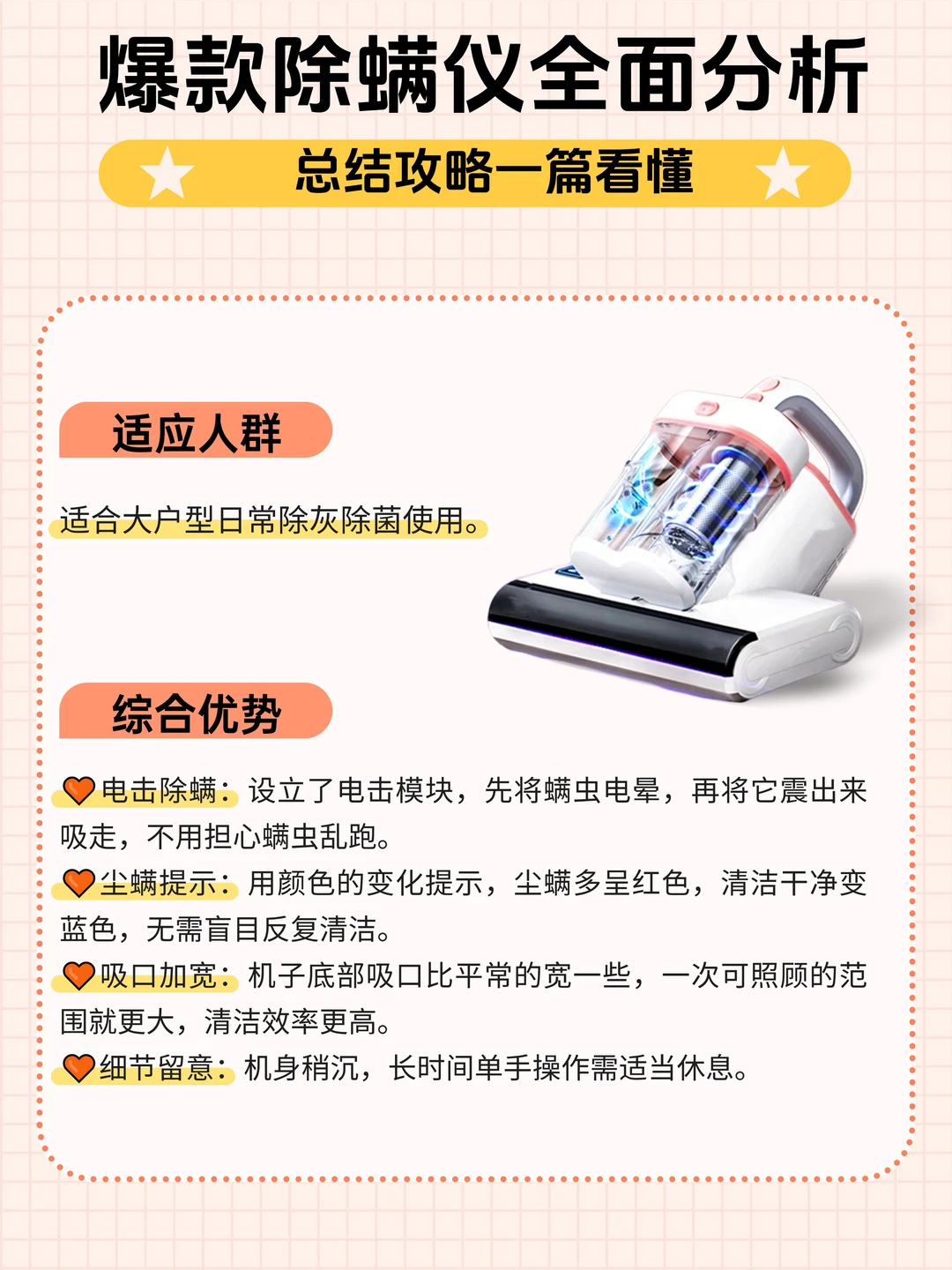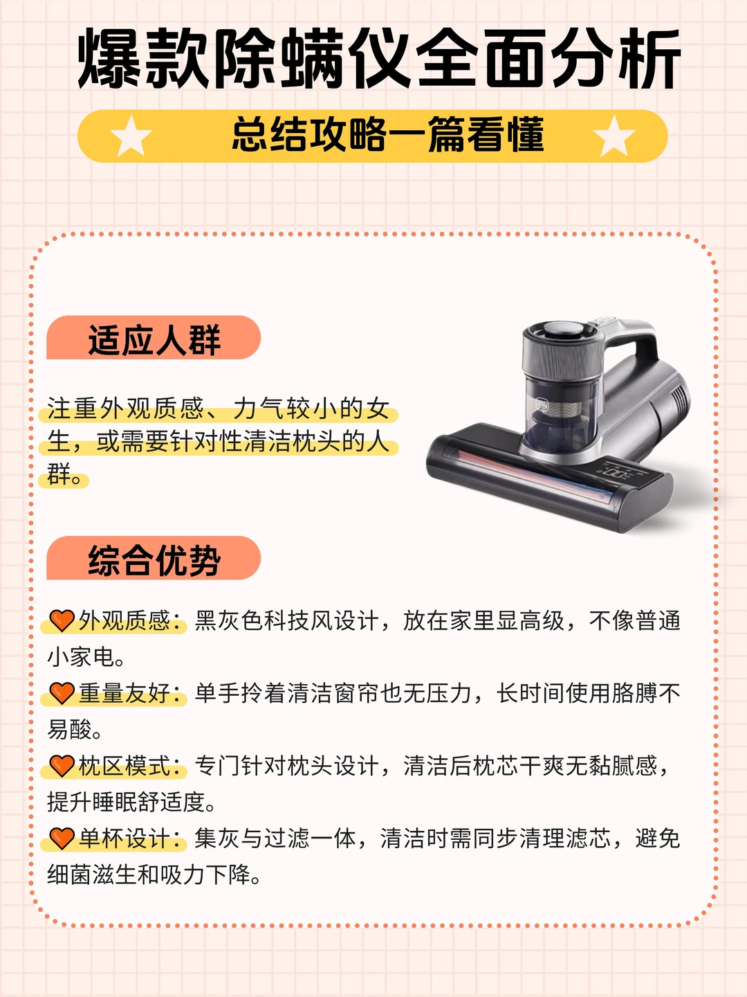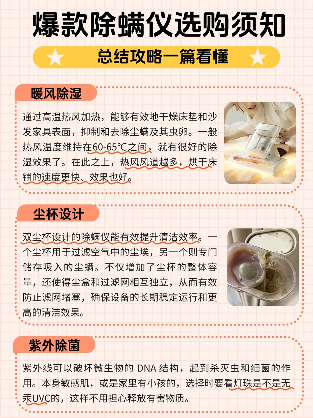 💫热风除湿:螨虫真的超爱潮乎乎的环境,梅雨季或者南方朋友肯定懂,这种天气里螨虫长得特别快。带热风的除螨仪就很管用,能把布料里的潮气烘干,让螨虫没法繁殖。挑的时候留意下热风的控温和风道,热风要匀,温度也得稳,不然一边烘不干一边还可能烫坏床品。