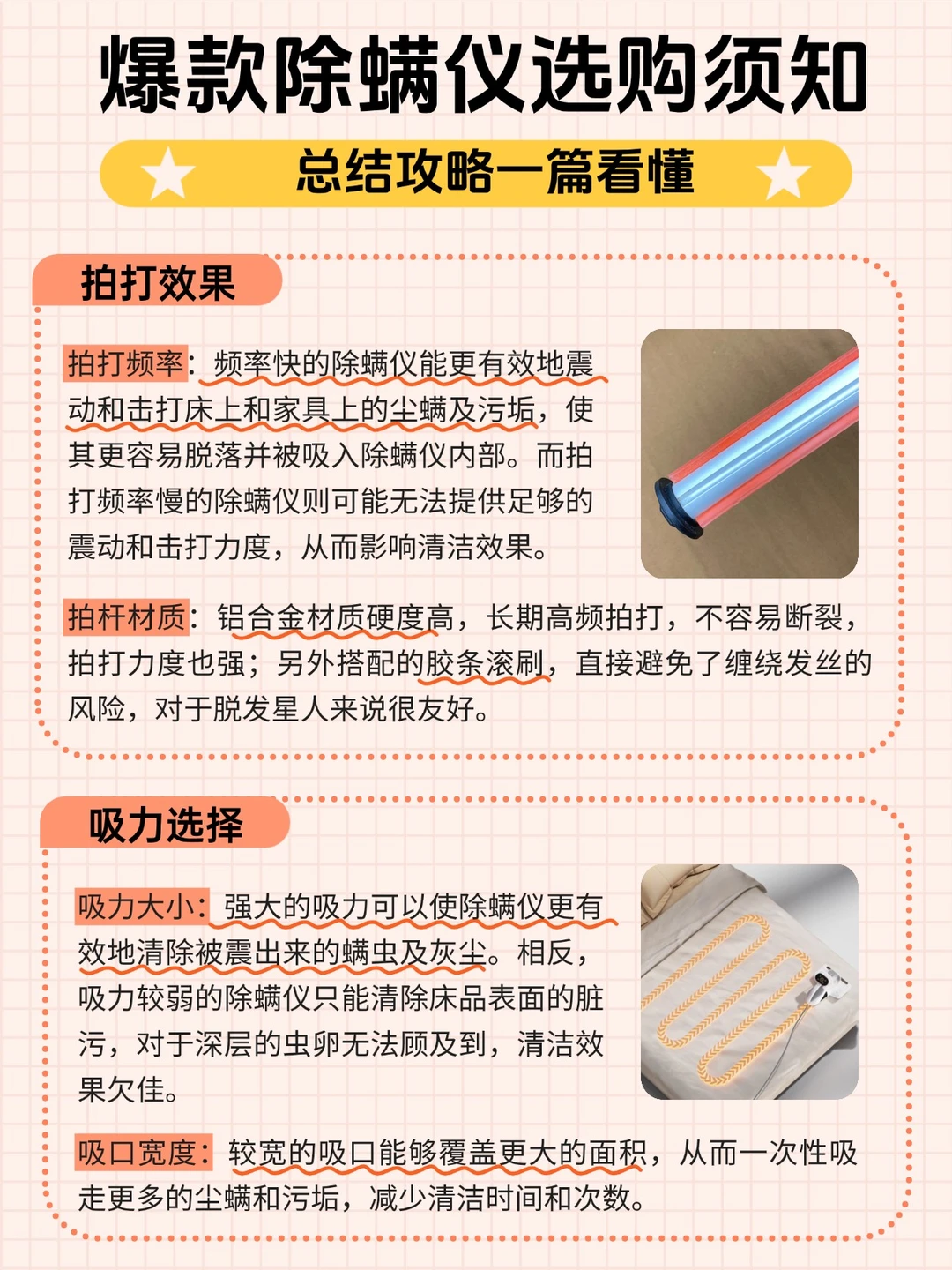💫吸力选择:光把螨虫震下来没用,要是吸力跟不上,这些小东西还得留在布料里。所以一定要选吸力足的,才能把震落的螨虫、虫卵连带着排泄物全吸走;吸口宽一点更省心,一次能扫一大片,清洁床垫、地毯时不用来回蹭,省老多力了。
