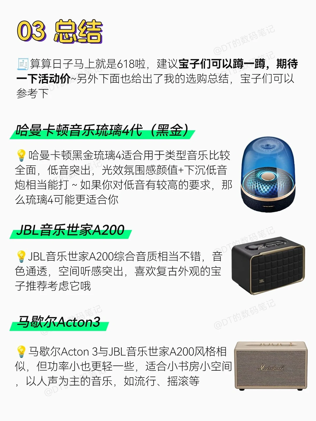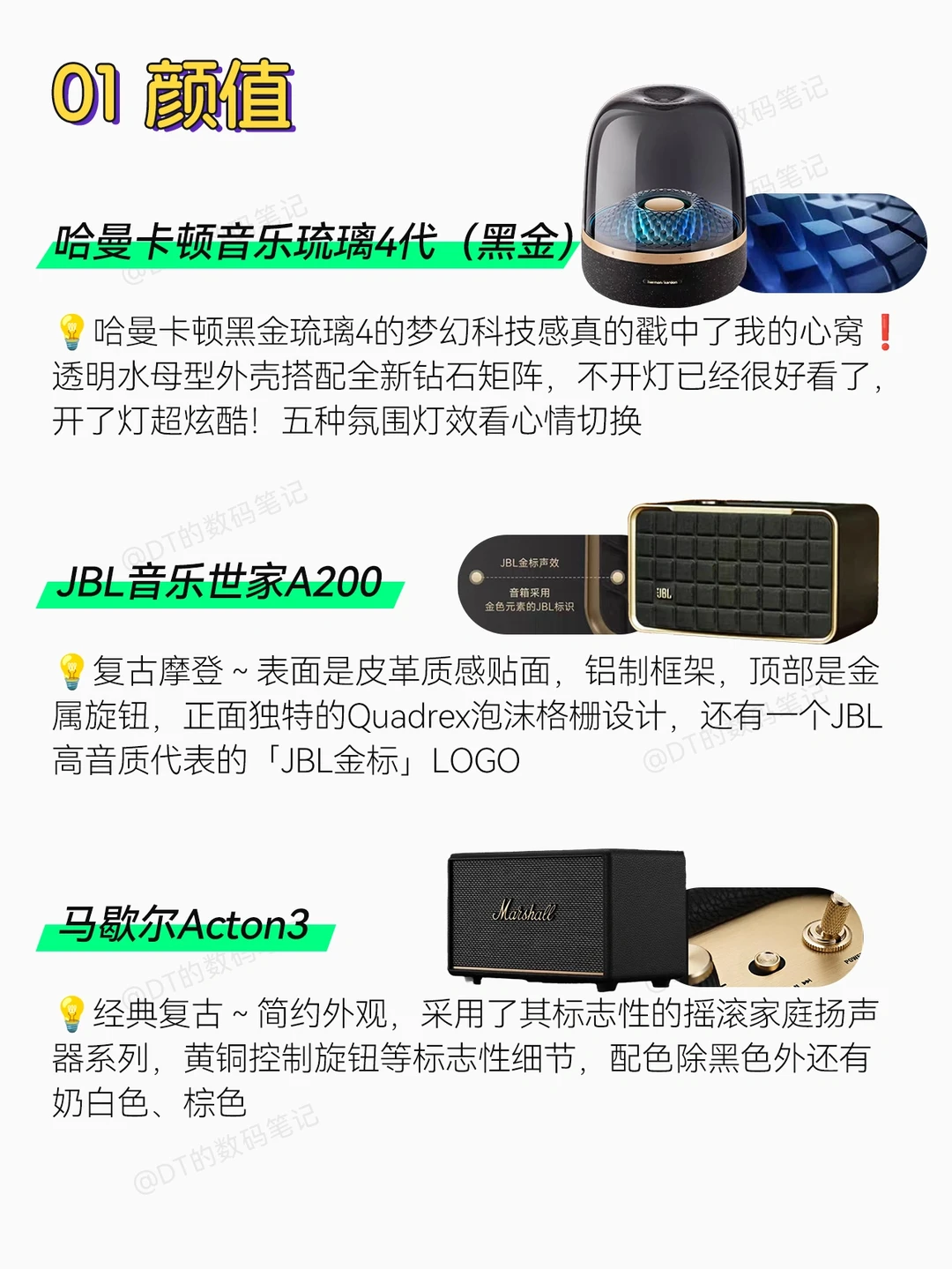 在入手之前也考虑过JBL音乐世家A200 和马歇尔Acton3 ,最后还是选择了「哈曼卡顿黑金琉璃4」,也是纠结了一番,我也总结了一下我自己的考虑 ,分享给大家,仅供参考哦~