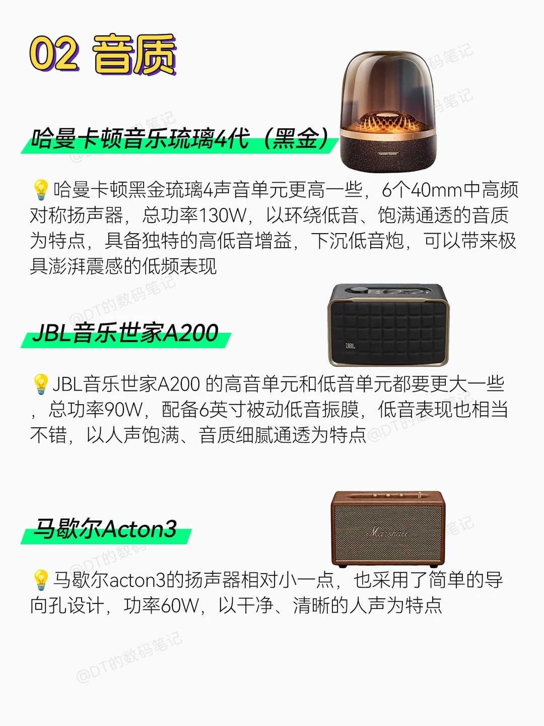 哈曼卡顿黑金琉璃4独立的高低音增益,下沉低音炮,可以适用各种类型的音乐;而JBL音乐世家A200 具有6英寸被动低音振膜,低音表现也相当不错;马歇尔Acton 3的低音表现则相对较弱。如果你对低音有较高的要求,那么哈曼卡顿黑金琉璃4可能更适合你[派对R]综合音质 JBL音乐世家A200会更好
