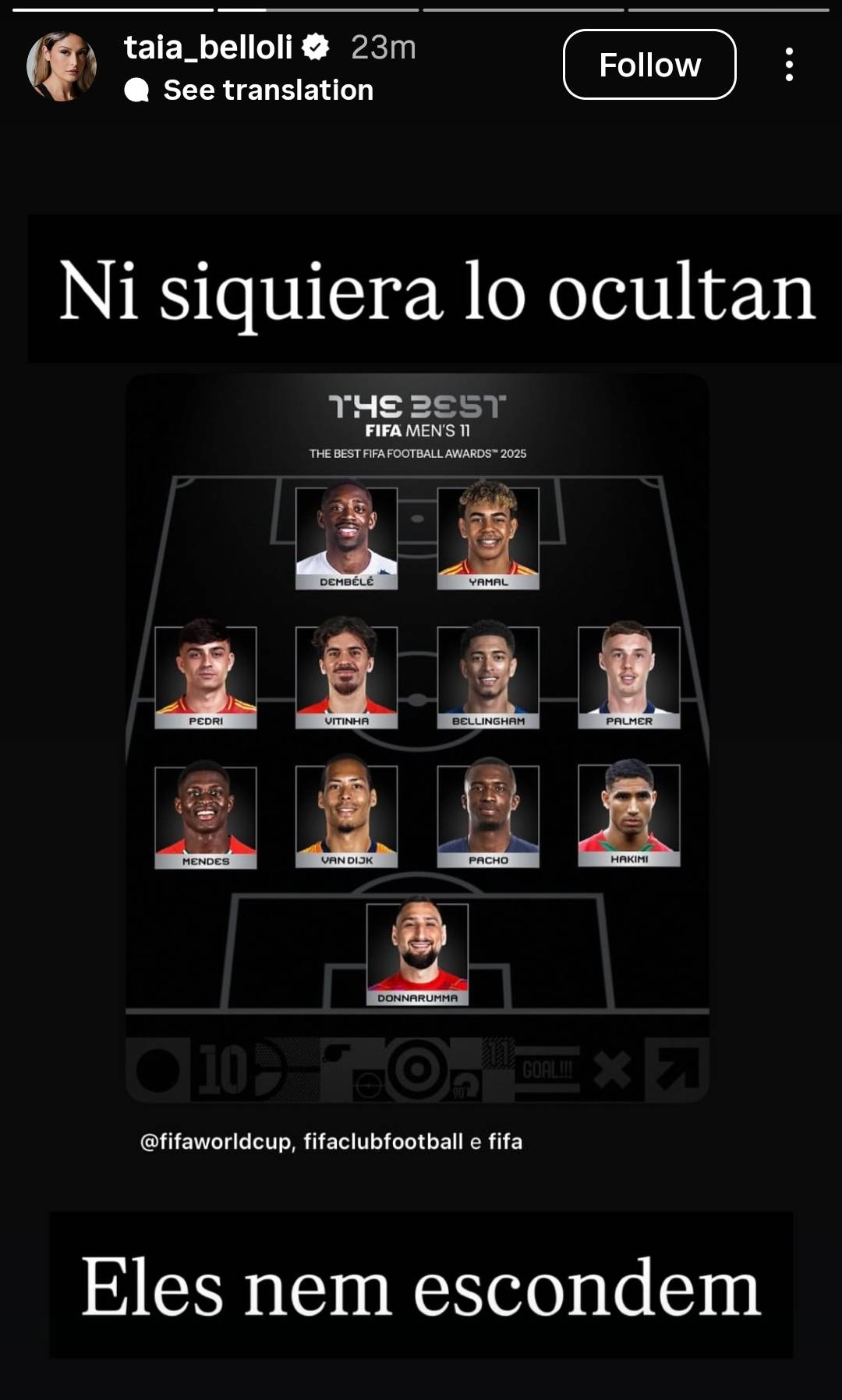 在FIFA公布2025年最佳男足11人的阵容后,巴塞罗那边锋拉菲尼亚的妻子通过社交媒体表达不满,已经连续发布多条动态。
