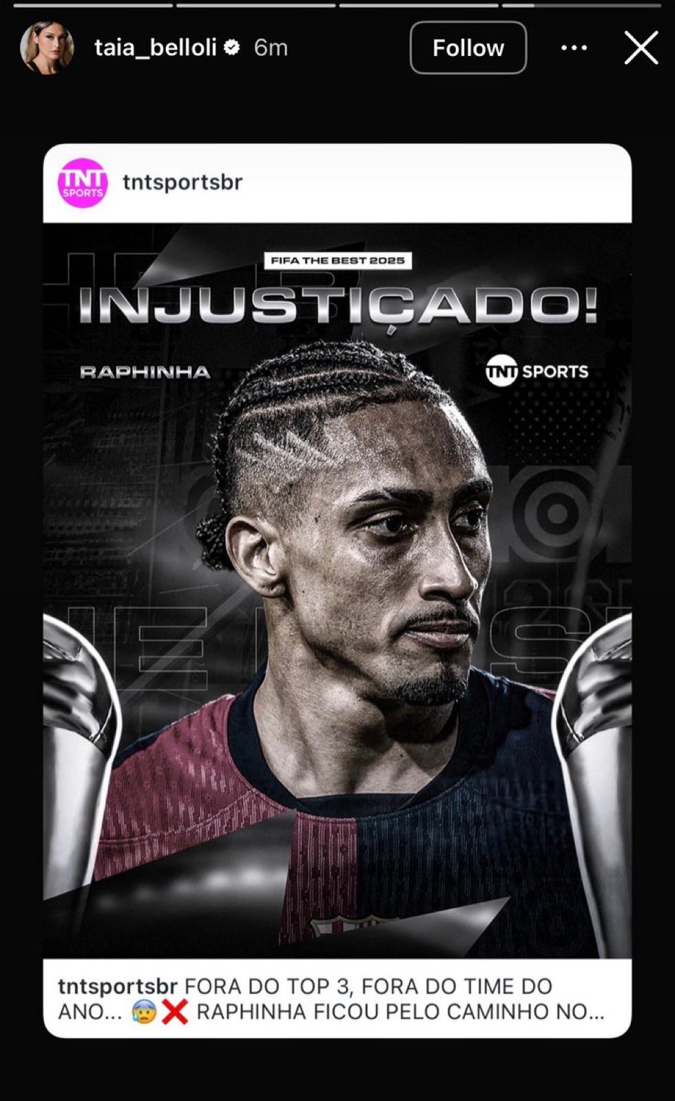 最新一条动态中,她转发了巴西媒体TNTSports制作的拉菲尼亚海报,图中直接写道“被不公正对待”,并指出拉菲尼亚无缘年度最佳阵容以及相关评选。