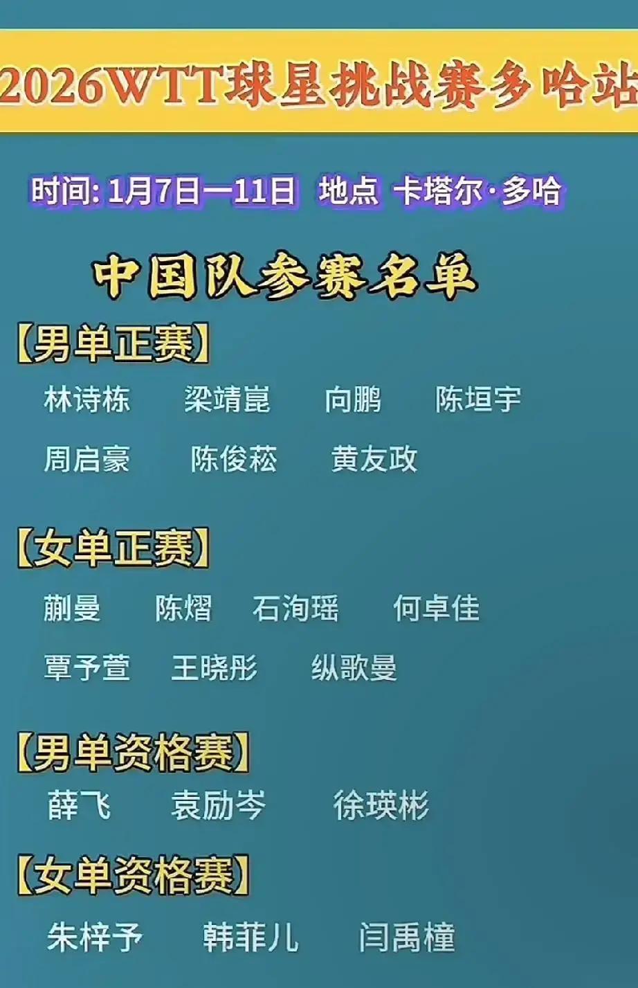 国乒这次多哈站的名单,够狠。 孙颖莎、王楚钦这些绝对主力,一个都不上。全派林诗栋、蒯曼这批00后去打,就一个身上有伤的老将梁靖崑压阵。 为啥这么干?明眼人都知道,这是冲着2028年洛杉矶奥运会去的。国际乒联马上要改规矩了,巴黎奥运会之后,一个协会单打最多只能上两人。你再强,名额就那么多。 所以,不能再只靠樊振东、孙颖莎这几张王牌打天下了。必须让新人去国际赛场真刀真枪地练,攒积分,见世面。哪怕眼前输几场,这个学费也得交。 老将们也没闲着。趁着轮休,用高科技手段抠技术细节,解决伤病隐患。这是把拳头收回来,准备下次打得更狠。 这步棋看得远。德国、日本这些对手,现在琢磨我们主力打法资料一堆,突然换上一批陌生小将,他们也得懵。咱们既练了兵,又搅乱了对手的备战节奏。 说白了,国乒这是在用现在的排名,换未来的冠军。格局打开了。好就是好,这种主动求变、为长远铺路的做法,比一直吃老本强。