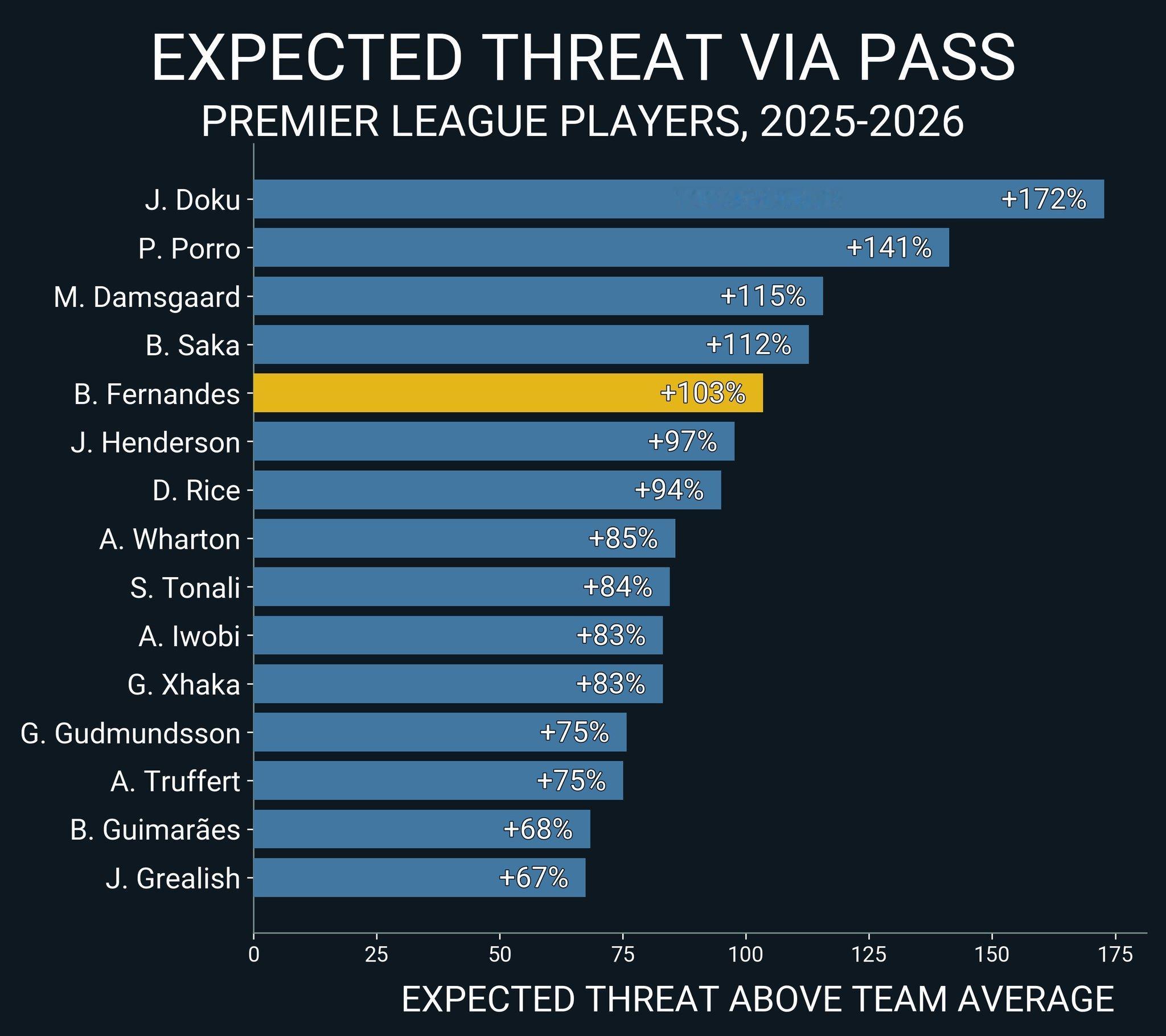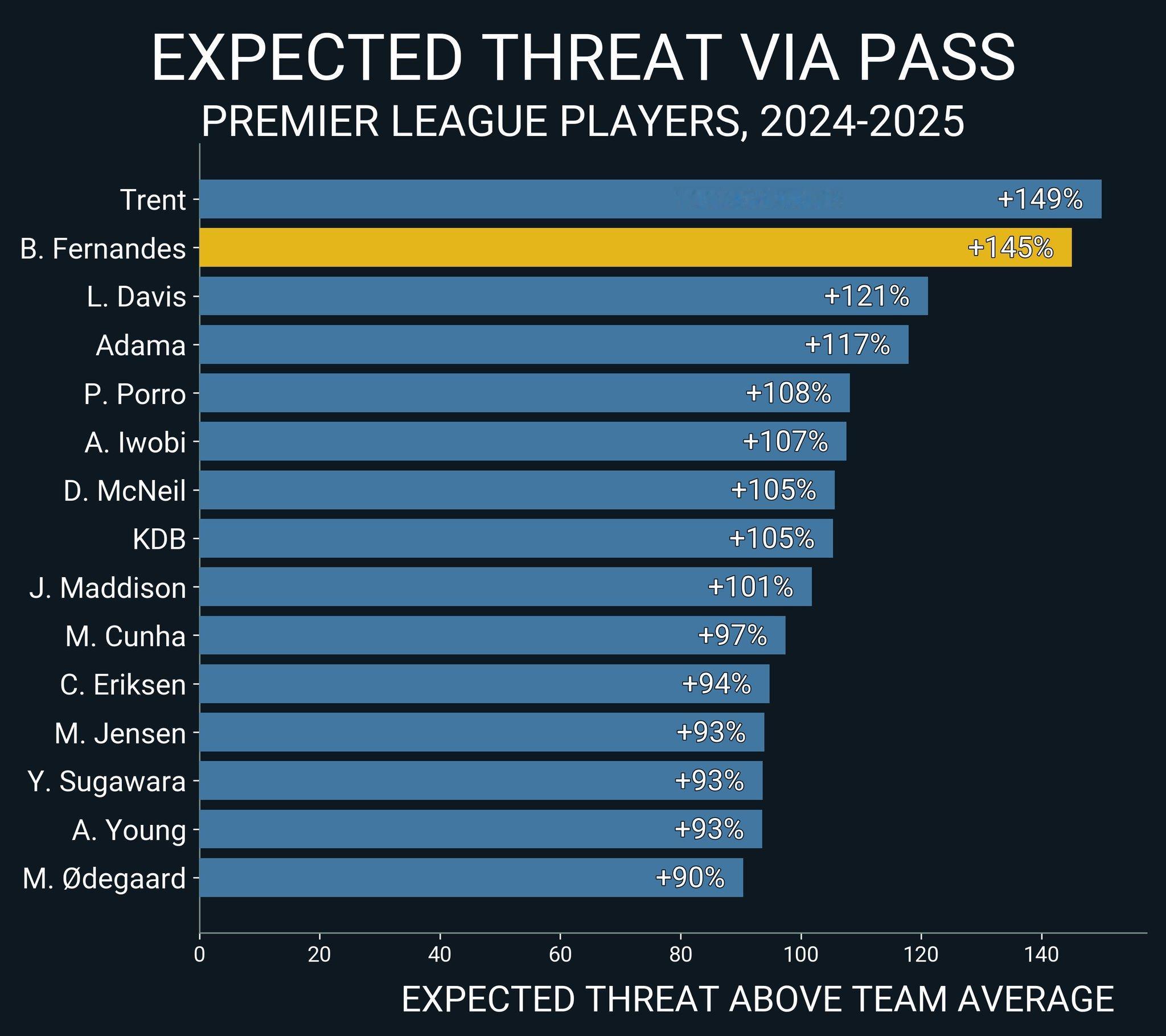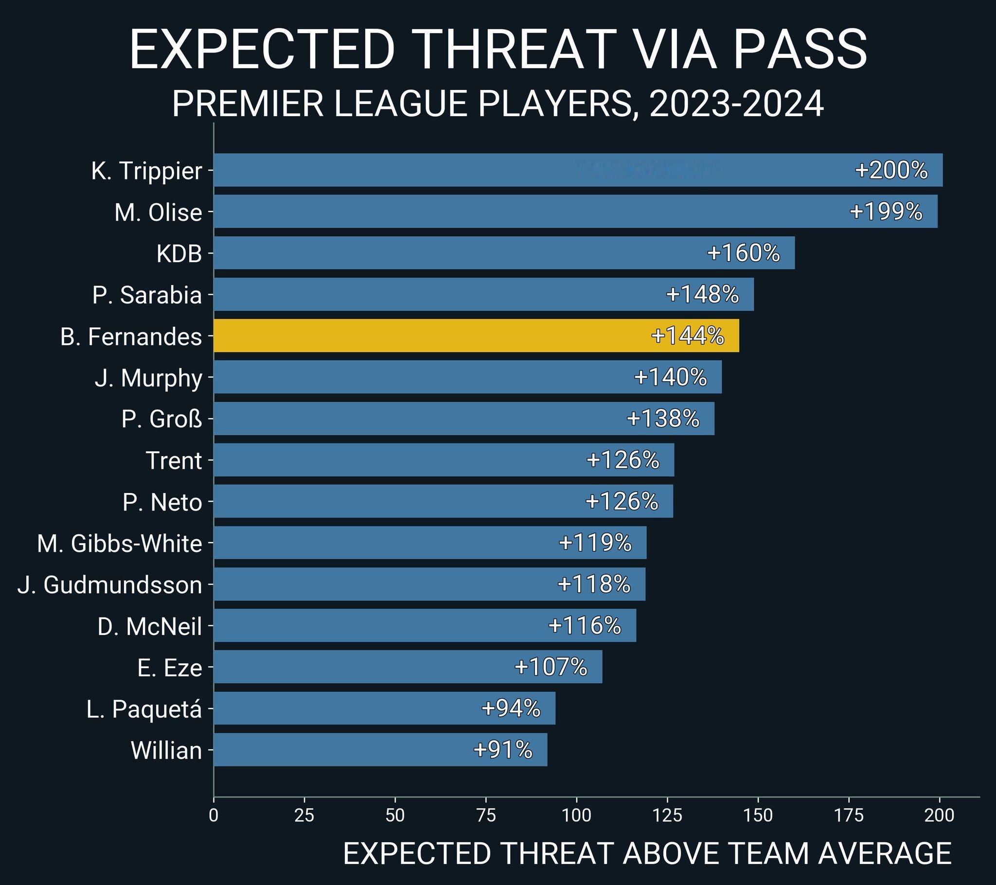 最近四个赛季的数据每脚传球带来的预期威胁是队友的几倍这是个相对指标其实可以看到球