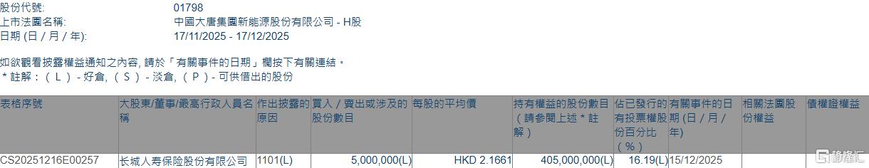 格隆汇12月17日丨根据联交所最新权益披露资料显示,2025年12月15日,大唐新能源(01798.HK)获长城人寿保险股份有限公司在场内以每股均价2.1661港元增持500万股,涉资约1083.05万港元。