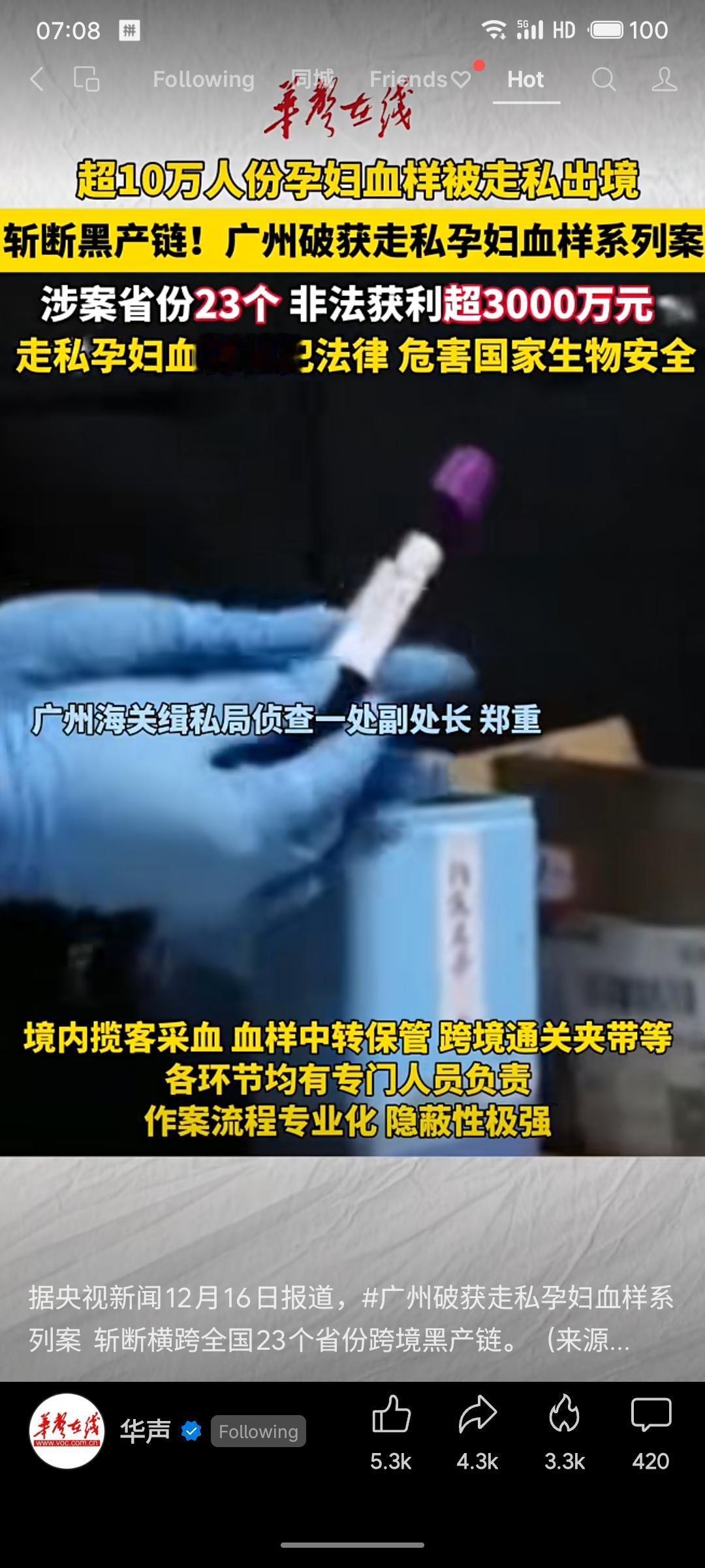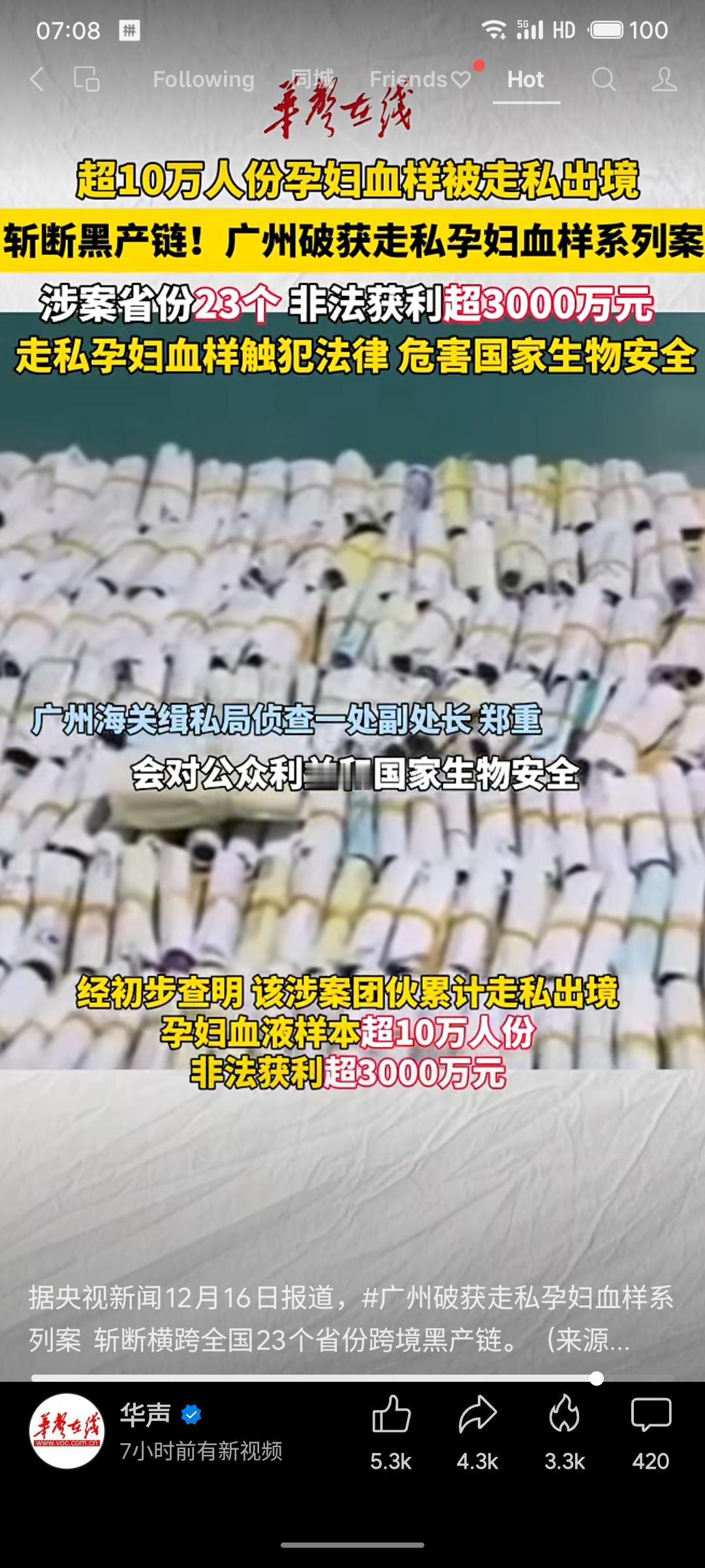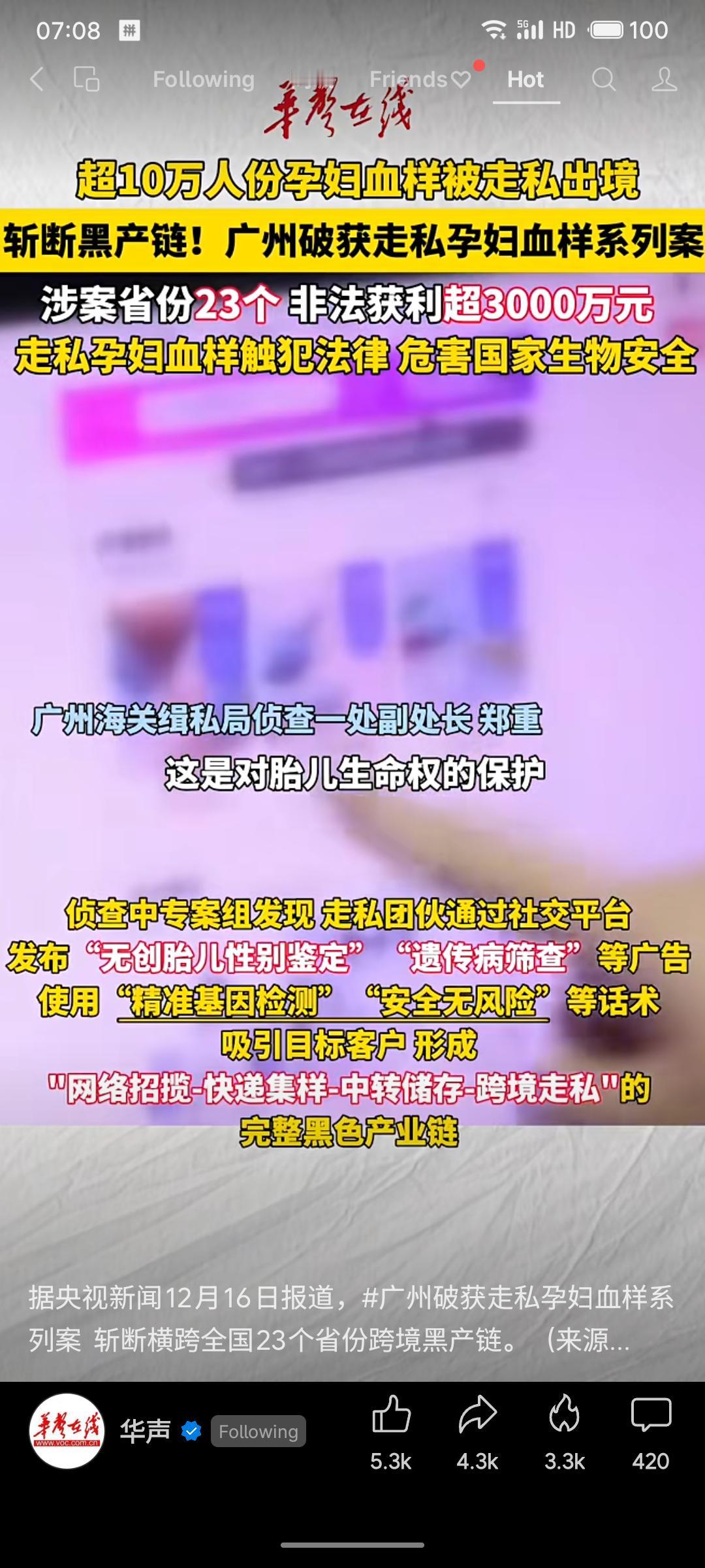 广州海关破获特大走私孕妇血样案,涉案血样超百万份,横跨23省,黑色产业链非法获利逾三千万元。该团伙以“胎儿性别鉴定”为幌子,将承载关键遗传信息的血样私运出境,严重危害国家生物安全与胎儿权益。此案揭示生物数据走私风险,执法利剑斩断黑产,守护国家安全与伦理底线。