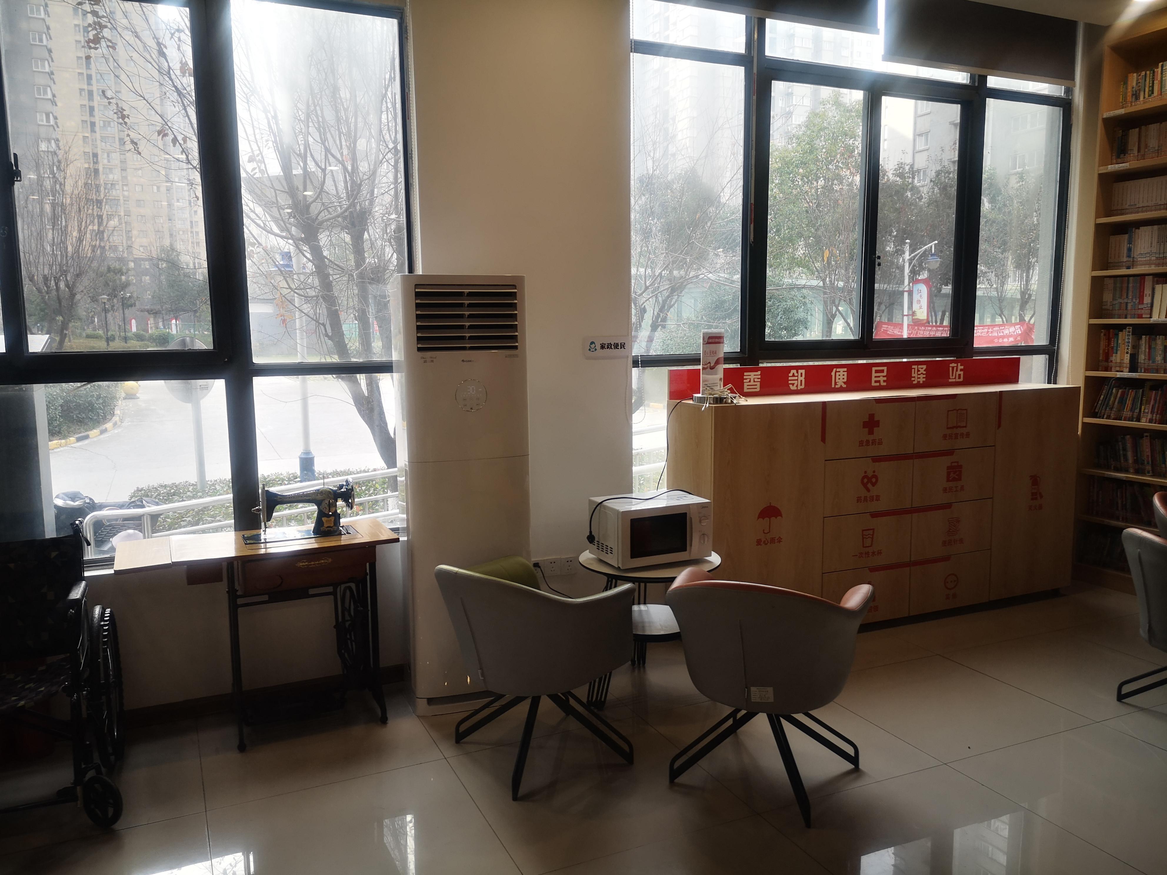 “以前出门遛弯想喝一口热水得跑回家,现在楼下这个驿站就随时能接热水喝,还给老人送饭呢,你看,这里还有志愿者捐的缝纫机、轮椅、药箱等,都是住户日常生活所需要的小事,服务越来越贴心了!”小区住户李师傅眉开眼笑,他和身边的邻居聊着家常。