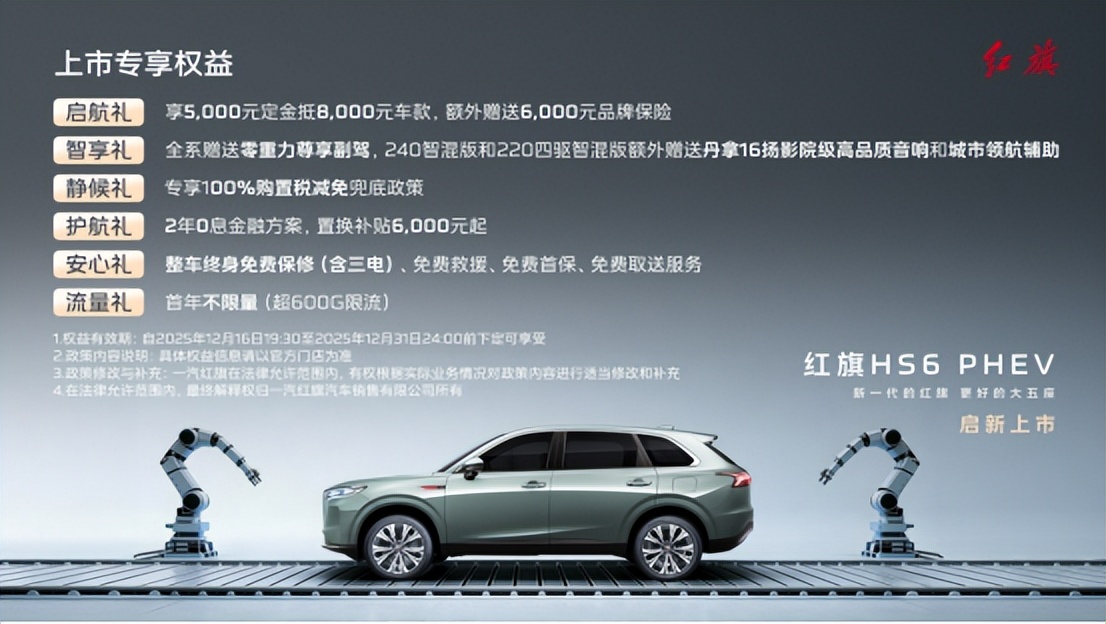 从一道道精密的工艺,到一项项严苛的测试,红旗HS6PHEV以全新的产品理念、全维的技术突破和全程的品质把控,兑现了“新一代的红旗,更好的大五座”承诺。新车承袭国车对品质与安全的极致追求,以17.88万元起售的价格,将一汽红旗对家的理解与关怀,转化为切实可感的获得感,让红旗HS6PHEV成为一汽红旗在新能源时代交给中国家庭的诚意之作。