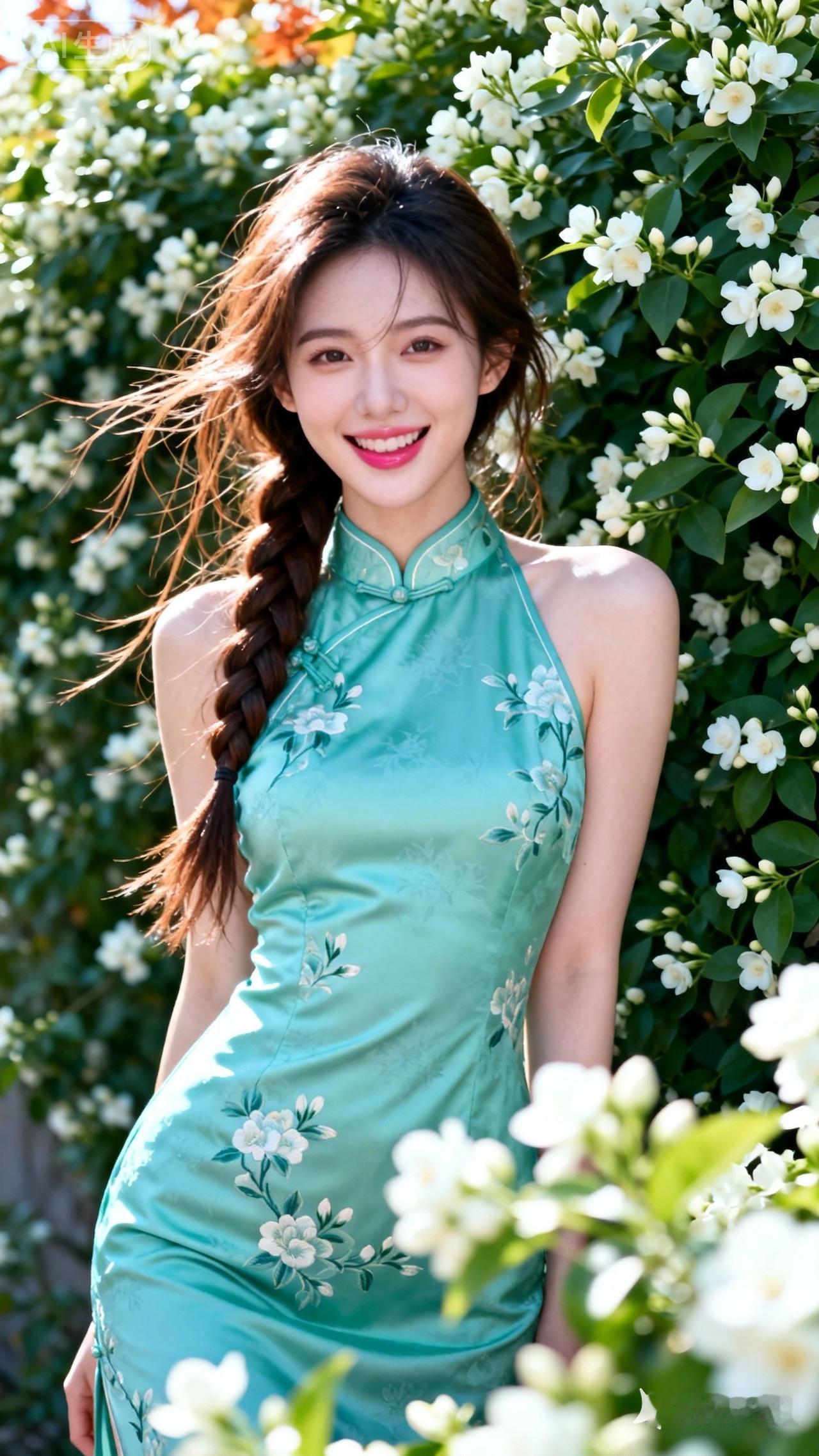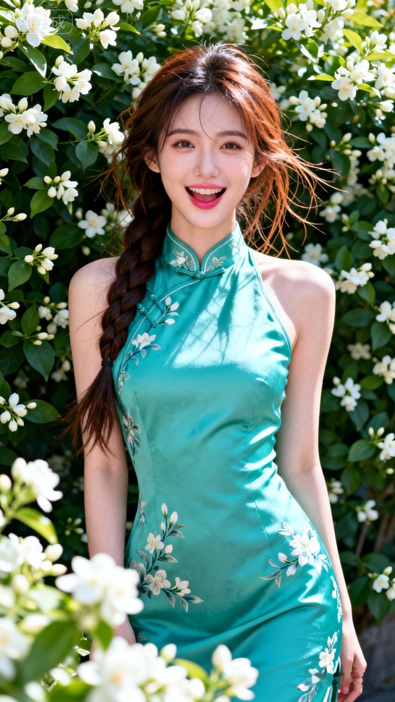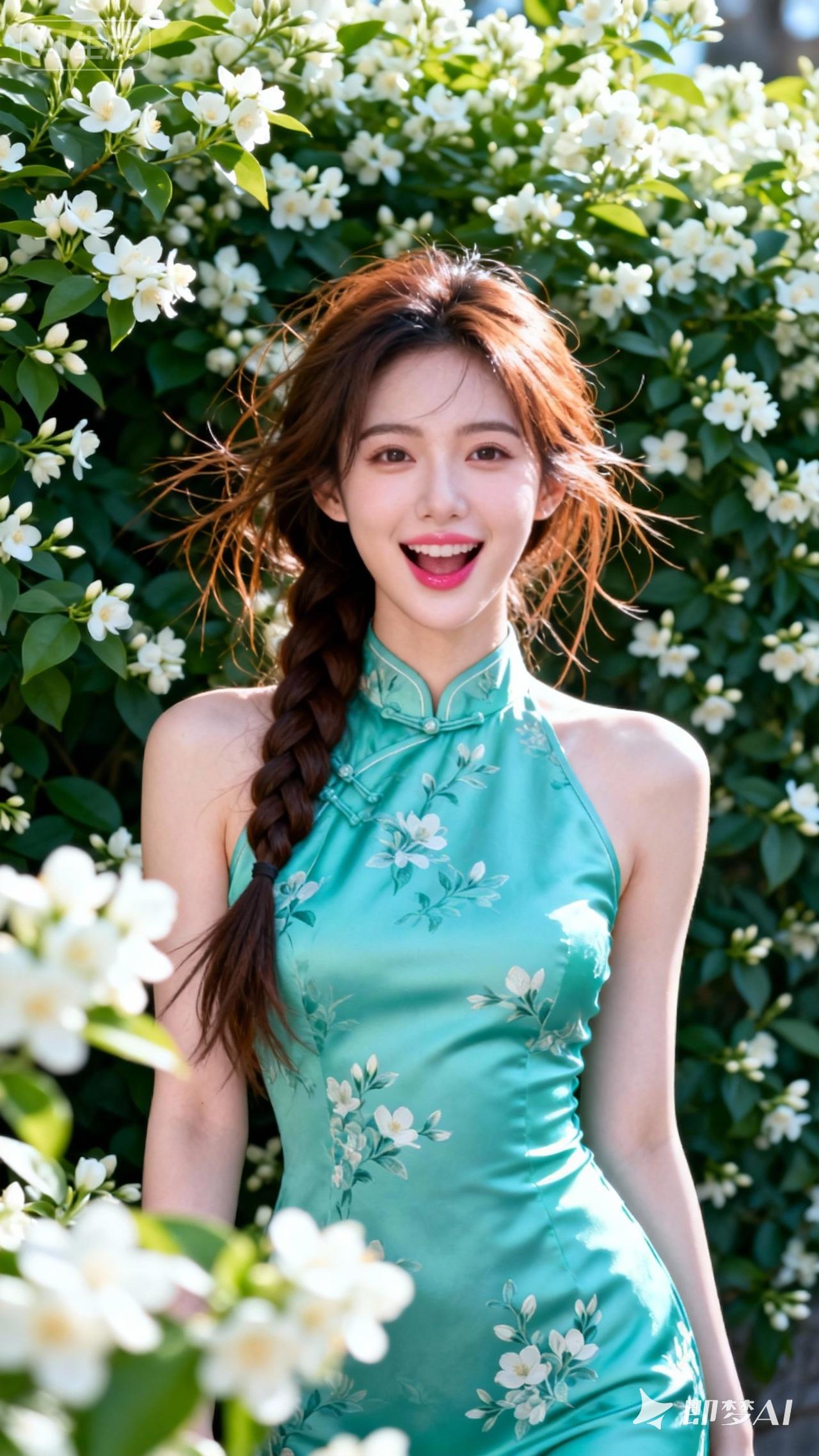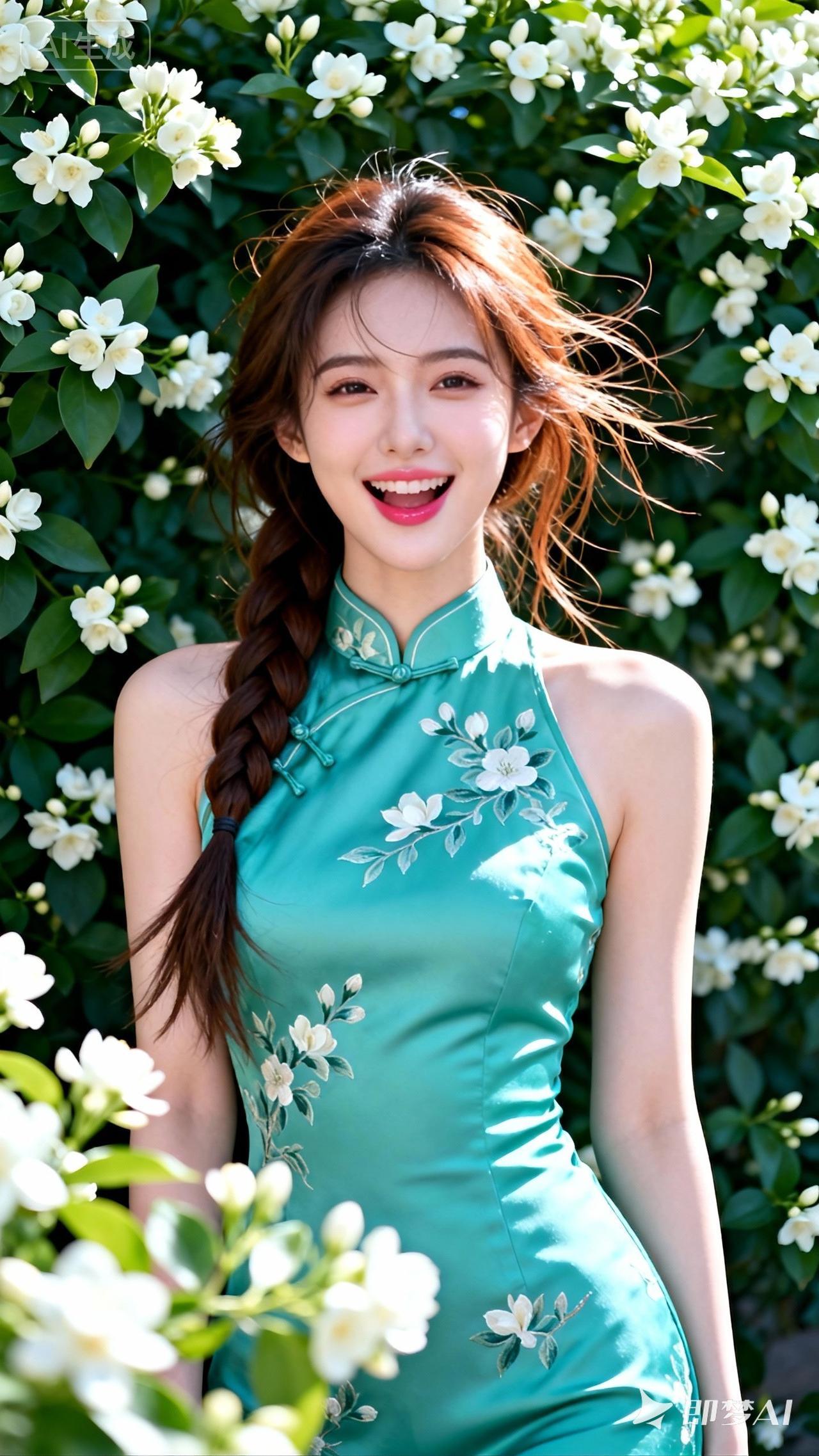 绿衣美人倚花丛,笑语盈盈似画卷。