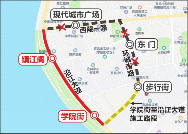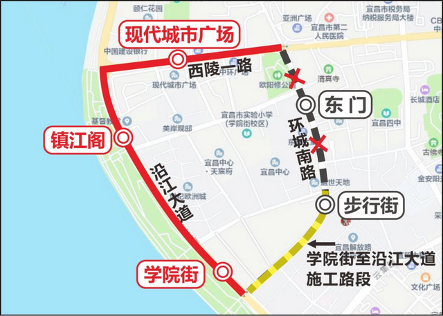 B6路(往三峡果蔬方向)、12路(终点调整至学院街下行站,往学院街方向)、B18路(往公交IC卡中心方向)、30路(往九安城方向)、B34路(双向)改经西陵一路——沿江大道运行。