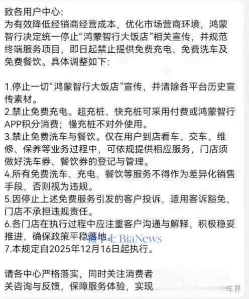 通知表示:为有效降低经销商经营成本,优化市场营商环境,鸿蒙智行决定统一停止“鸿蒙智行大饭店”相关宣传,并规范终端服务项目,即日起禁止提供免费充电、免费洗车及免费餐饮。