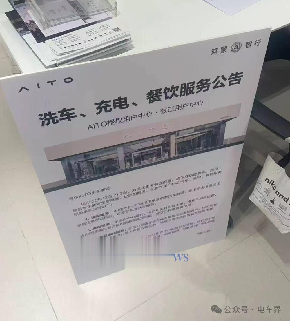 今早,社交媒体已流传出“AITO授权中心张江用户中心”的洗车、充电、餐饮服务公告,与内部通知内容一致,新政策从12月19日起生效。