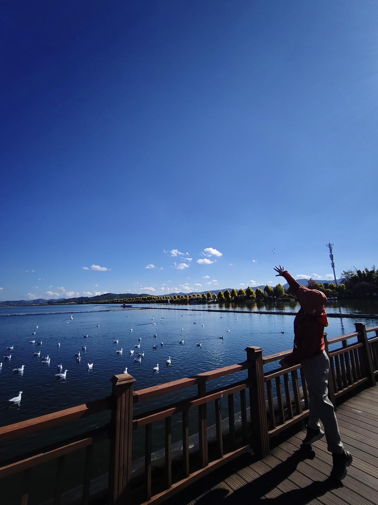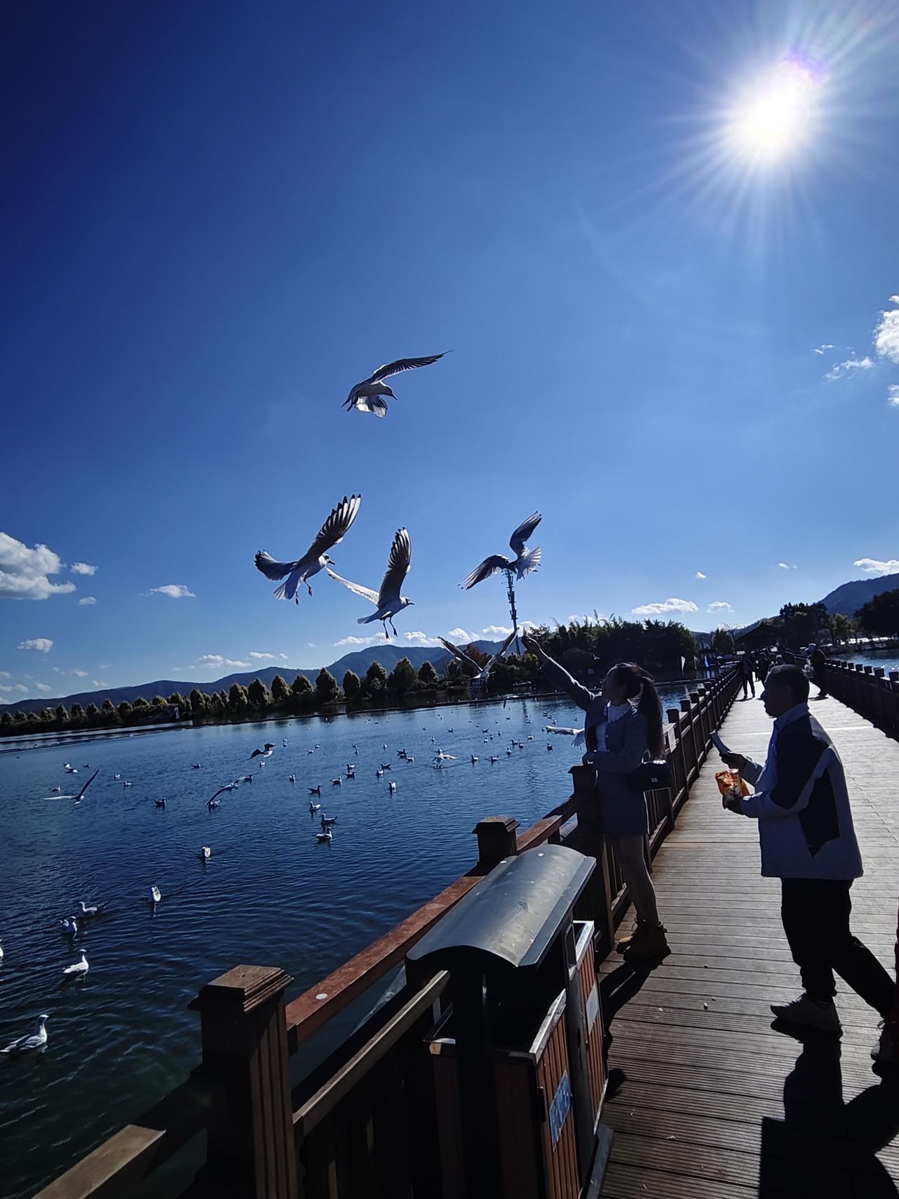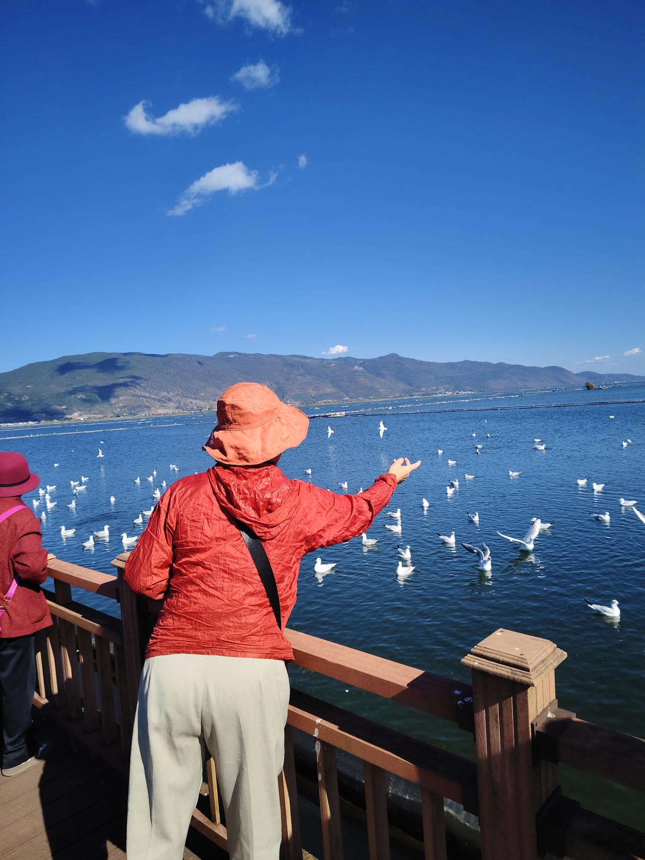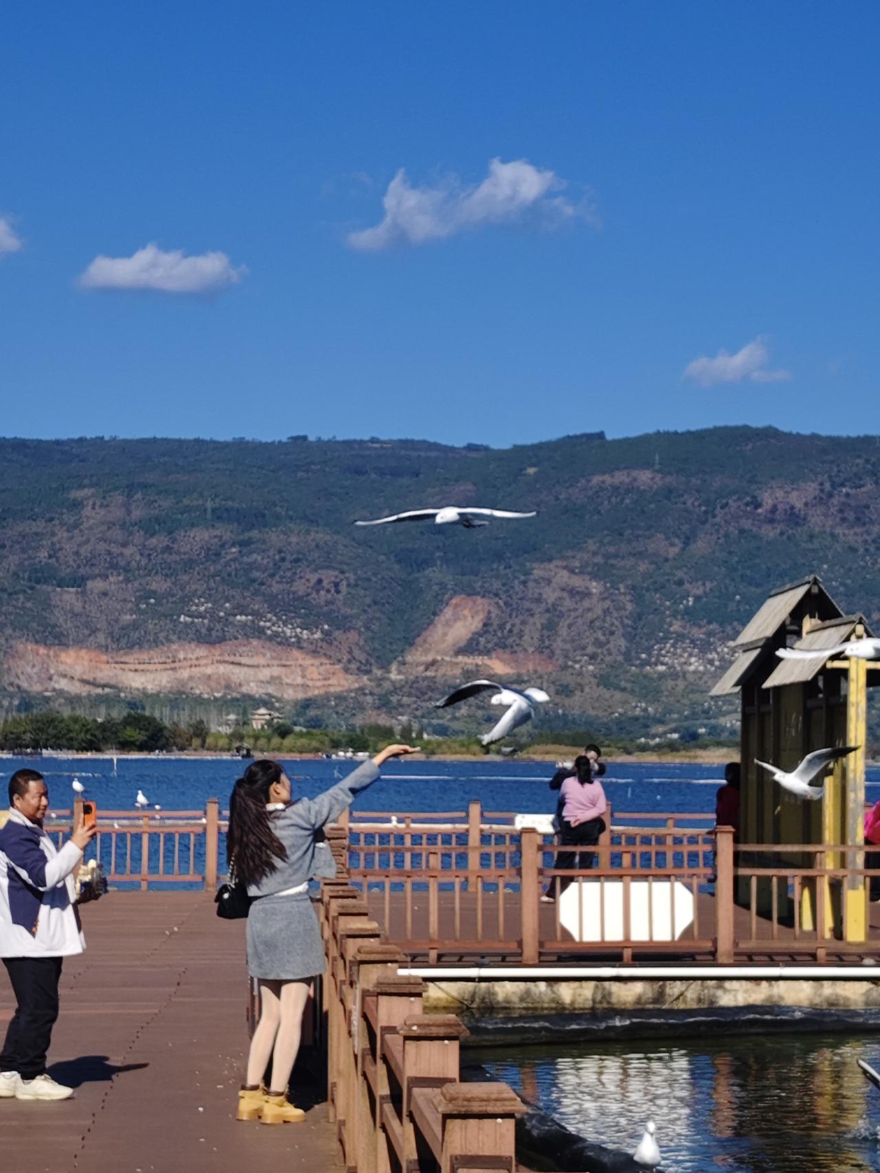 异龙湖上的红嘴鸥 曾经在昆明的滇池,我们有过投喂红嘴鸥的幸福经历。听说异龙湖也来了红嘴鸥,我们今天去看看是否是真的。当我把车停在异龙湖游船风景区停车场,一走上栈桥,便看到了远端的湖面上有大片的红嘴鸥,栈桥上有许多来看红嘴鸥的人们。我和老伴儿便不由自主的加快了脚步。 到了廊桥之处,有许多人在投喂红嘴鸥,老伴儿立马加入到了投喂人群的行列。投喂人群中,有男有女有老有少,有一位年逾古稀的老太太投喂的最起劲。为了投喂的效果,她把手臂扬得高高,想让鸥鸟在空中便开始哄抢。为了达到想要的结果,她甚至采用了助跑投喂的方式,这那是投喂呀,这是掷标枪吧!而那些小朋友投喂的方式就含蓄的多,温柔的多,不讲究投喂的形式而在效果。有一个女孩儿的投喂方式最特别,她手持一块儿方便面,让红嘴鸥来啄食,这便有了最近距离的投喂,这种投喂的画面很和谐,很唯美,看着都让人心里暖暖的。 我并没有去投喂,我心里在想,我和红嘴鸥是一样的,都居住生活在北方,因为避寒我们才离开故乡来到他乡。在异龙湖相遇,其实我们都是在投喂对方,一个获得的是物质享受,另一个获得的是精神食粮。 再过些日子,我们都会离开由他乡返回故乡,我只是想问问眼前的鸥鸟,你们什么时间返程,我们明年还来异龙湖,你们呢?