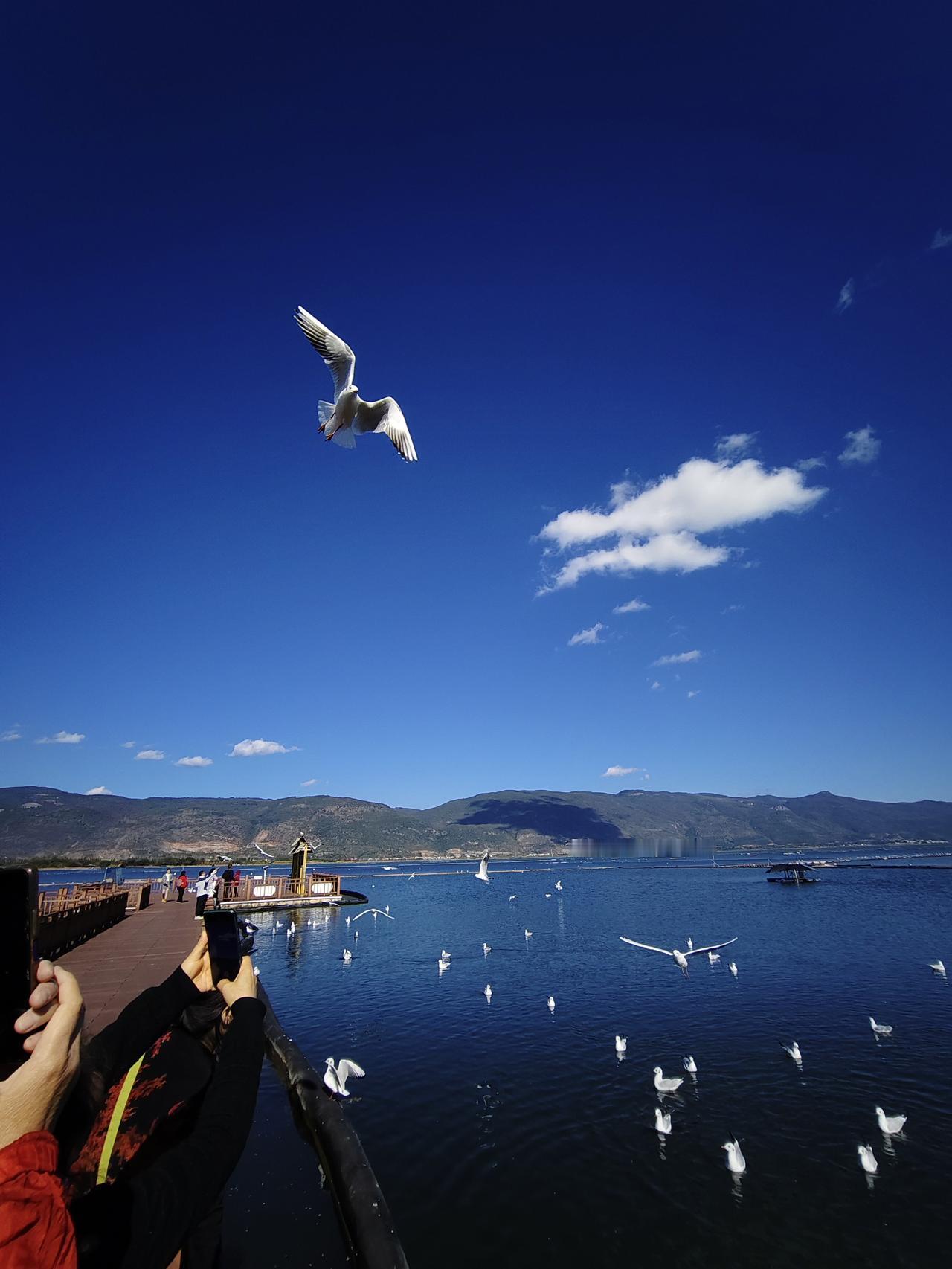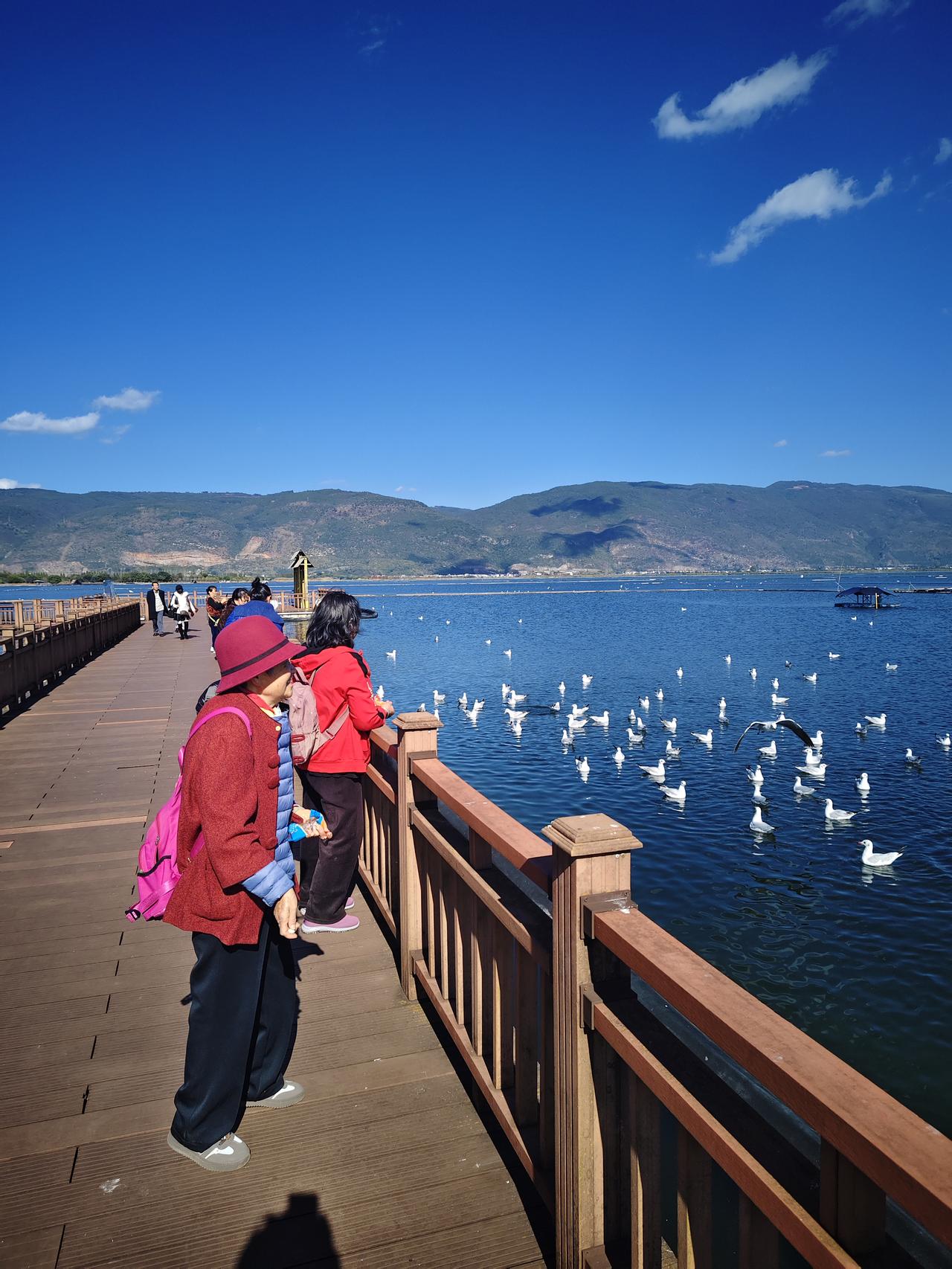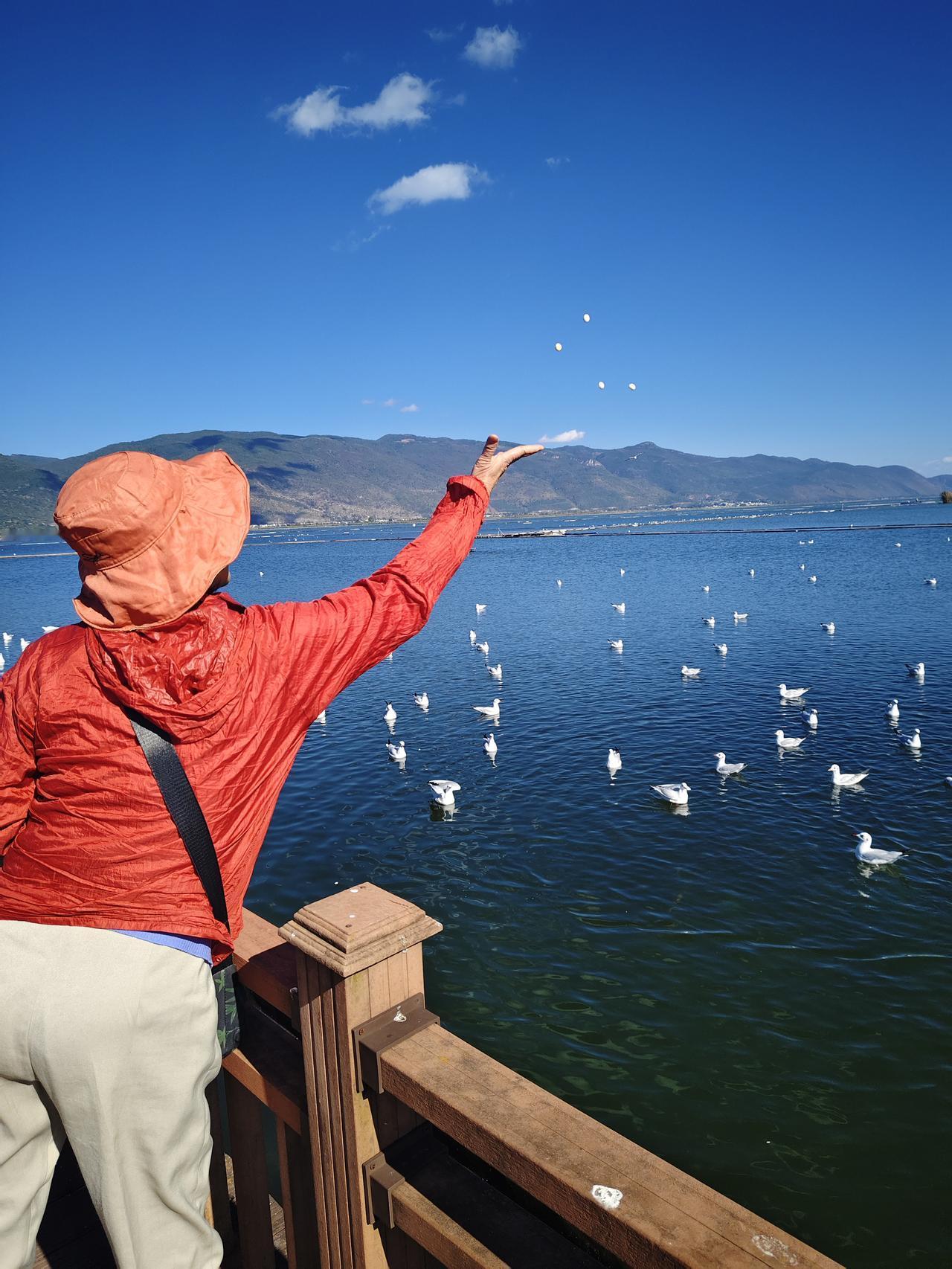 异龙湖上的红嘴鸥 曾经在昆明的滇池,我们有过投喂红嘴鸥的幸福经历。听说异龙湖也来了红嘴鸥,我们今天去看看是否是真的。当我把车停在异龙湖游船风景区停车场,一走上栈桥,便看到了远端的湖面上有大片的红嘴鸥,栈桥上有许多来看红嘴鸥的人们。我和老伴儿便不由自主的加快了脚步。 到了廊桥之处,有许多人在投喂红嘴鸥,老伴儿立马加入到了投喂人群的行列。投喂人群中,有男有女有老有少,有一位年逾古稀的老太太投喂的最起劲。为了投喂的效果,她把手臂扬得高高,想让鸥鸟在空中便开始哄抢。为了达到想要的结果,她甚至采用了助跑投喂的方式,这那是投喂呀,这是掷标枪吧!而那些小朋友投喂的方式就含蓄的多,温柔的多,不讲究投喂的形式而在效果。有一个女孩儿的投喂方式最特别,她手持一块儿方便面,让红嘴鸥来啄食,这便有了最近距离的投喂,这种投喂的画面很和谐,很唯美,看着都让人心里暖暖的。 我并没有去投喂,我心里在想,我和红嘴鸥是一样的,都居住生活在北方,因为避寒我们才离开故乡来到他乡。在异龙湖相遇,其实我们都是在投喂对方,一个获得的是物质享受,另一个获得的是精神食粮。 再过些日子,我们都会离开由他乡返回故乡,我只是想问问眼前的鸥鸟,你们什么时间返程,我们明年还来异龙湖,你们呢?