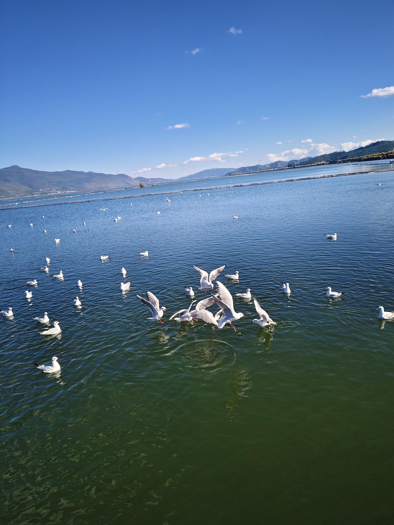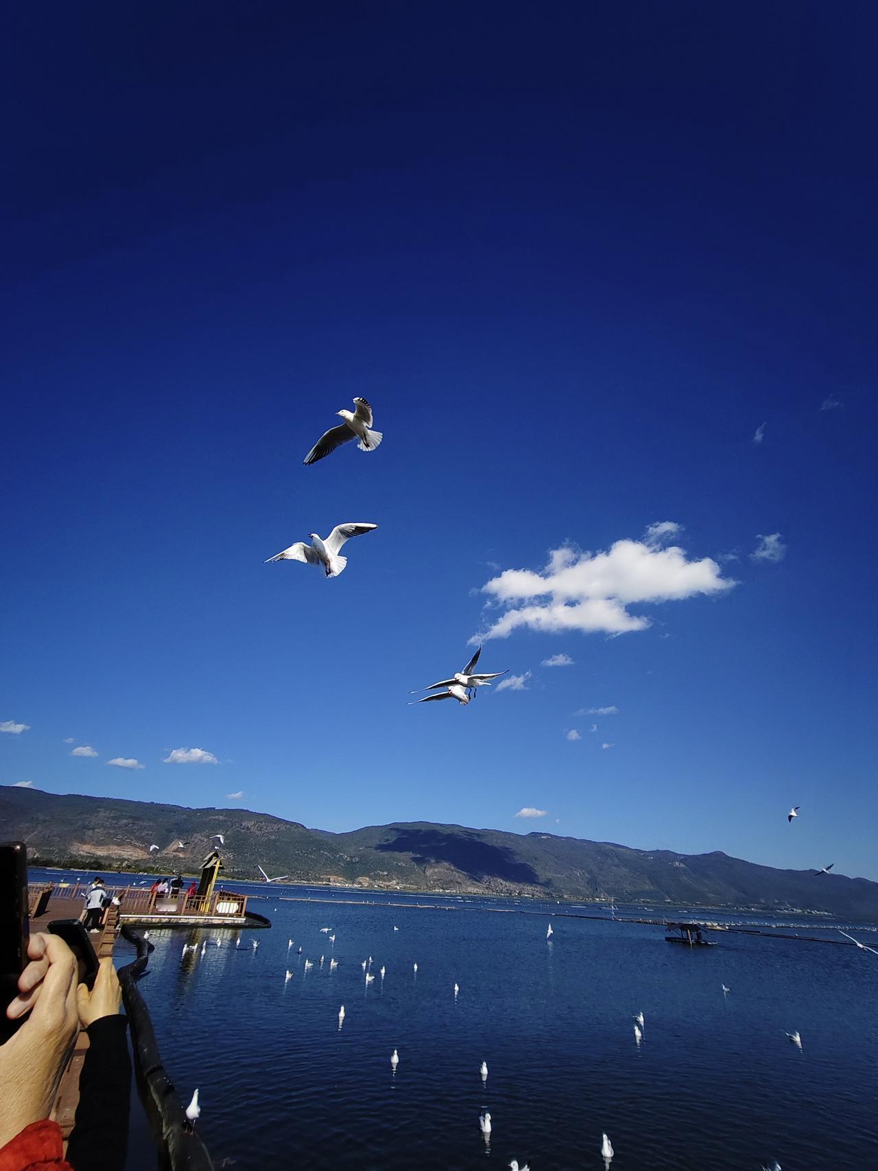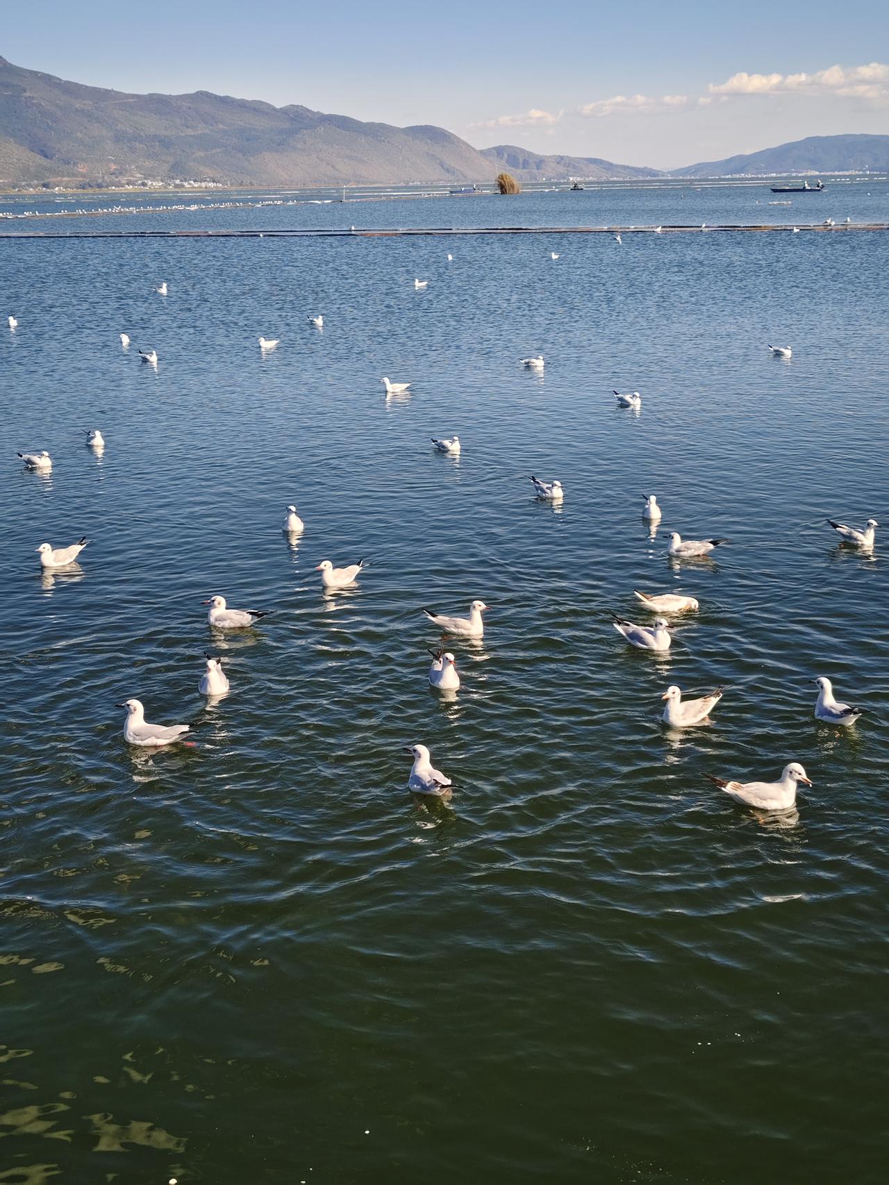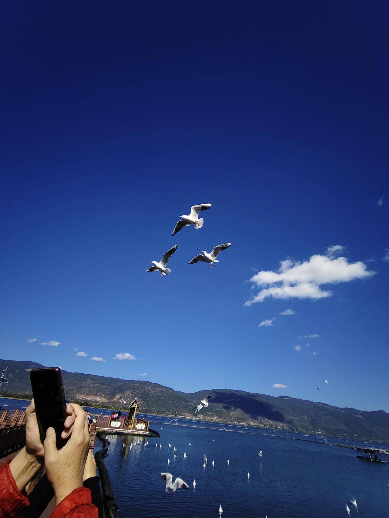 异龙湖上的红嘴鸥 曾经在昆明的滇池,我们有过投喂红嘴鸥的幸福经历。听说异龙湖也来了红嘴鸥,我们今天去看看是否是真的。当我把车停在异龙湖游船风景区停车场,一走上栈桥,便看到了远端的湖面上有大片的红嘴鸥,栈桥上有许多来看红嘴鸥的人们。我和老伴儿便不由自主的加快了脚步。 到了廊桥之处,有许多人在投喂红嘴鸥,老伴儿立马加入到了投喂人群的行列。投喂人群中,有男有女有老有少,有一位年逾古稀的老太太投喂的最起劲。为了投喂的效果,她把手臂扬得高高,想让鸥鸟在空中便开始哄抢。为了达到想要的结果,她甚至采用了助跑投喂的方式,这那是投喂呀,这是掷标枪吧!而那些小朋友投喂的方式就含蓄的多,温柔的多,不讲究投喂的形式而在效果。有一个女孩儿的投喂方式最特别,她手持一块儿方便面,让红嘴鸥来啄食,这便有了最近距离的投喂,这种投喂的画面很和谐,很唯美,看着都让人心里暖暖的。 我并没有去投喂,我心里在想,我和红嘴鸥是一样的,都居住生活在北方,因为避寒我们才离开故乡来到他乡。在异龙湖相遇,其实我们都是在投喂对方,一个获得的是物质享受,另一个获得的是精神食粮。 再过些日子,我们都会离开由他乡返回故乡,我只是想问问眼前的鸥鸟,你们什么时间返程,我们明年还来异龙湖,你们呢?