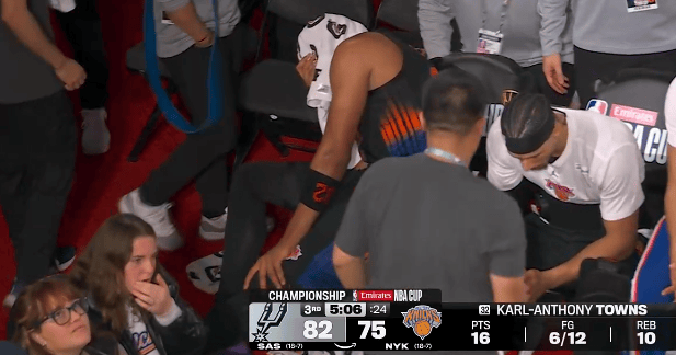 第三节比赛中,唐斯扭到膝盖受伤下场,回到替补席头盖毛巾手摸着膝盖,目前出战25分钟12中6得到16分10篮板。