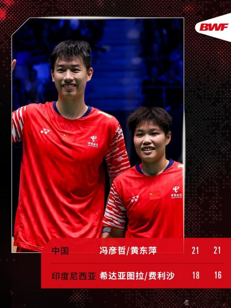 本场比赛中,冯彦哲/黄东萍2-0希达亚图拉/费利沙,比分为:21-18,21-16。