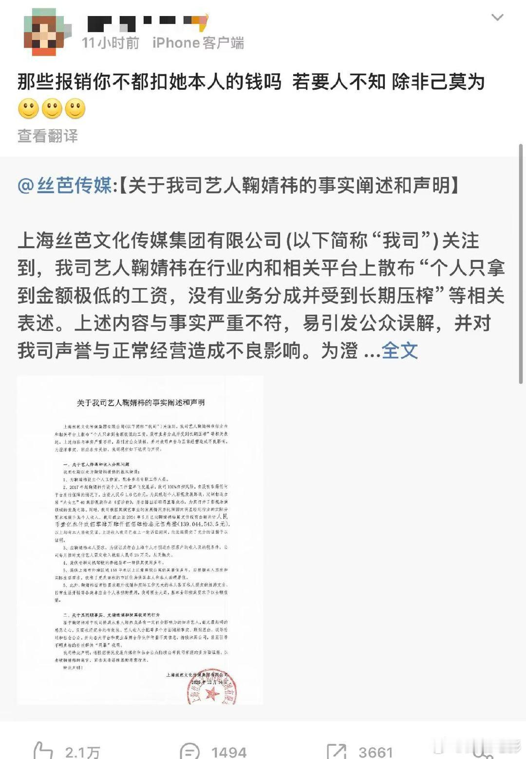 前助理称报销费是扣鞠婧祎的钱前助理称鞠婧祎报销是扣鞠婧祎的钱 12月16日,在声明中称鞠婧祎经常报销和工作无关支出:“鞠婧祎经常性要求额外报销和实际工作无关的本人甚至私人朋友的旅游支出、日常生活开销等各类本应由个人承担的费用,我司顾全大局,基本全部按其要求予以全额报销。”前助理为发声称鞠婧祎报销是扣鞠婧祎的钱:“那些报销你不都扣她本人的钱吗 若要人不知 除非己莫为 ”鞠婧祎每月25万元固定工资