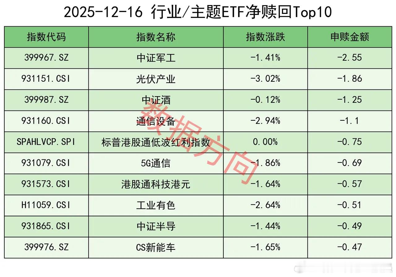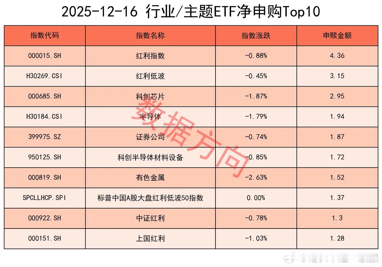 ETF连续4天获净申购12月16日星期二,大盘单边下行、全线调整,仅有以商业百货为代表的消费方向逆市上涨。上证指数跌幅1.11%,上交所iconETF合计净申购 52.63亿元,这是连续第4天获得净申购。宽指中证iconA500指数(19.79亿)、科创50指数(16.38亿),双双净申购超过15亿。上证指数(6.9亿),净申购超过5亿。中证1000指数(1.82亿)、中证500指数(0.92亿)、科创创业50指数(0.89亿)、上证180指数(0.47亿)、中证A50指数(0.12亿),分别获小幅净申购。上证50指数(-11.29亿),净赎回icon超过10亿。沪深300指数(-2.67亿)、科创100指数(-0.08亿),分别被小幅净赎回。行业和主题 红利指数(4.36亿)、红利低波指数(3.15亿)、标普icon中国A股大盘红利低波50指数(1.37亿)、中证红利指数(1.3亿)、上国红利指数(1.28亿),5个红利类指数进入申购icon榜;标普港股通icon低波红利指数(-0.75亿)进入赎回榜。科创芯片指数(2.95亿)、半导体指数(1.94亿)、科创半导体材料设备指数(1.72亿),一起进入申购榜;中证半导指数(-0.49亿)进入赎回榜。证券公司icon指数(1.87亿)、有色金属指数(1.52亿),一起进入申购榜。光伏产业icon指数(-1.86亿)、CS新能车指数(-0.47亿),一起进入赎回榜。通信设备指数(-1.1亿)、5G通信指数(-0.69亿),一起进入赎回榜。其他进入赎回榜的还有:中证军工指数(-2.55亿)、中证酒指数(-1.25亿)、港股通科技港元指数(-0.57亿)、工业有色指数(-0.51亿)。ETF