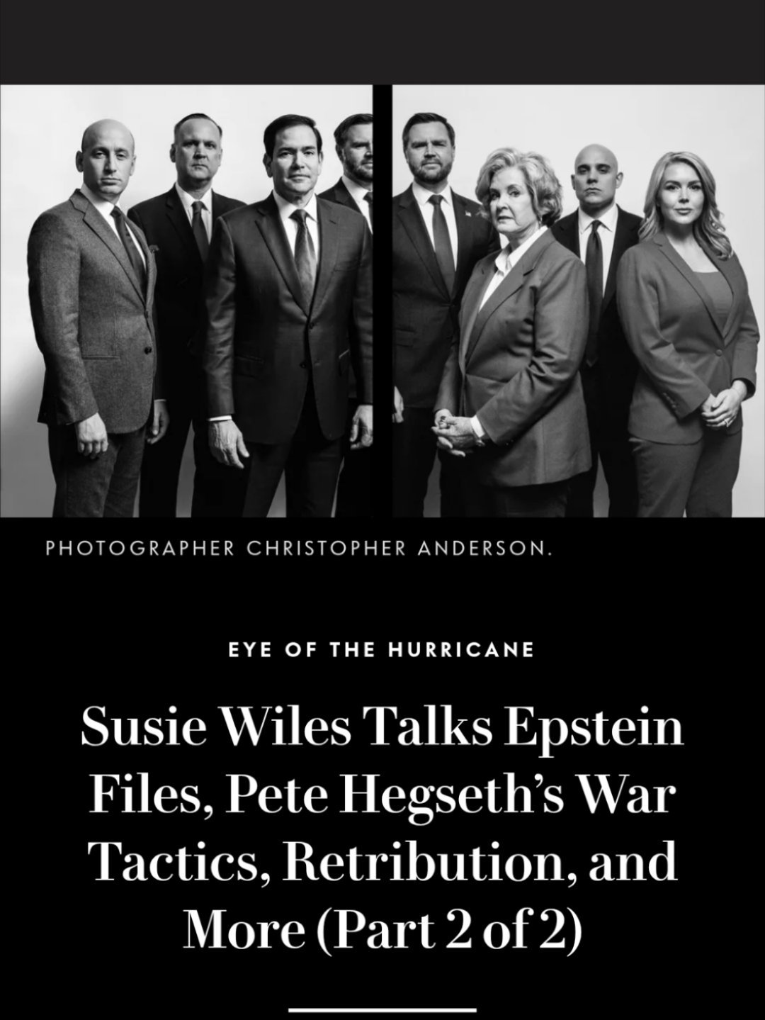 特朗普认定委政府是恐怖组织人人都知道,特朗普醉翁之意不在酒,表面上打不存在的禁毒牌。现在的推特很热闹,因为特朗普的大管家、幕僚长、亲密战友苏茜·怀尔斯,在采访里大爆料!一个采访了尼克松时代以来所有幕僚长的记者,过去一年采访了她十余次,她几乎无所不谈!1⃣️ 特朗普就是想打服委内瑞拉,让他喊叔叔。2⃣️ 特朗普有“酗酒者般的性格”,万斯是一个投机者,过去十来年都是阴谋论者。3⃣️ 特朗普认为俄罗斯想要整个乌克兰。4⃣️ 马斯克是公开的氯胺酮使用者。在白宫时睡睡袋,她看不懂他,怀疑他的大脑有时候是嗨着的。5⃣️ 特朗普就是在使用法律工具打击报复政敌。本来约定上台100天后放弃报复议程,但是没有。6⃣️ 鲁比奥承认,2028让位给万斯,扶持他选总统。7⃣️ 特朗普跟她说过多次,不会竞选2028,认为该做的都做了。他故意说会选,是为了刺激别人。8⃣️ 特朗普计划对委内瑞拉发动地面攻击,届时需要国会授权。鲁比奥、万斯几乎每天都去国会山,在那里游说,为后面的同意提前拉票。感到最搞笑的是,¹ 长篇采访发表后,她说她被坑了,曲解了上下文语境。² 特朗普的团队排着队,张声援爱豆一样替她挽尊。鲁比奥、商务部长、卫生部长、司法部长、情报总监。。。全部发帖,团建,统一口径。特朗普以前的幕僚长任期都不长,都是退下来才写书揭秘特朗普团队。这位资深的竞选专家这时候就大爆料,完了又不认,极其罕见。重点是,特朗普的最亲密助手一个个都摆拍,集体配合了采访和照相。每个追踪特朗普2.0决策过程的人都应该反复看完采访,存档。这个团队史无前例!热点科普