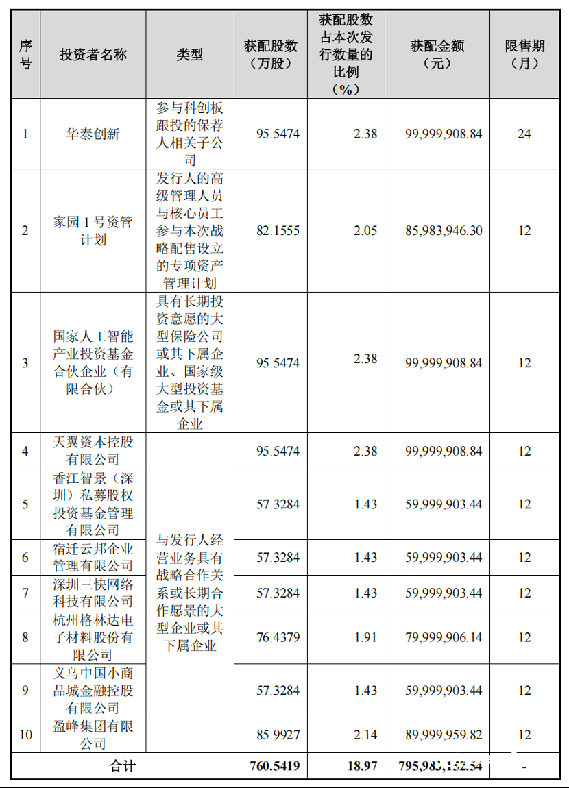 此次有10家机构参与沐曦股份战略配售,共计认购760.5419万股。其中,不仅有在今年1月成立的“国家队”成员——国家人工智能产业投资基金的身影,京东旗下宿迁云邦企业管理有限公司、中国电信旗下天翼资本以及美团旗下深圳三快网络科技有限公司也纷纷现身。值得一提的是,中国电信和美团旗下公司此前也曾出现在摩尔线程的战略配售名单之中。
