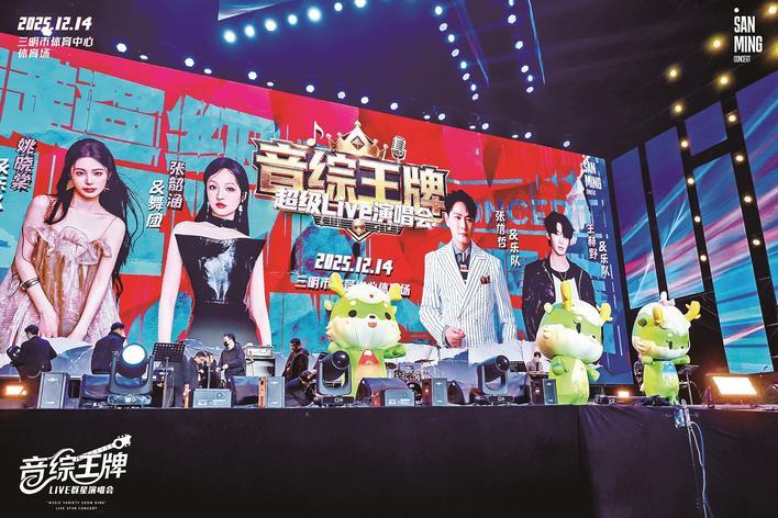 12月14日晚,三明“超级LIVE演唱会”现场,三明城市吉祥物“明明”闪现舞台。这组来自广州全运会大湾鸡吉祥物气模同一生产厂家的麒麟宝一族首次公开亮相,瞬间点燃全场气氛。