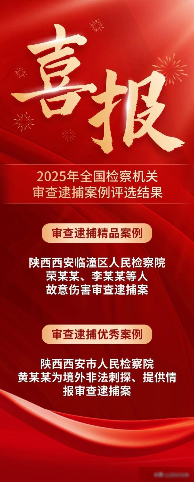 12月16日,最高人民检察院通报2025年全国检察机关审查逮捕案例评选结果,“审查逮捕精品案例”20件、“审查逮捕优秀案例”30件,其中临潼区人民检察院办理的荣某某、李某某等人故意伤害审查逮捕案入选“审查逮捕精品案例”,西安市人民检察院办理的黄某某为境外非法刺探、提供情报审查逮捕案入选“审查逮捕优秀案例”。