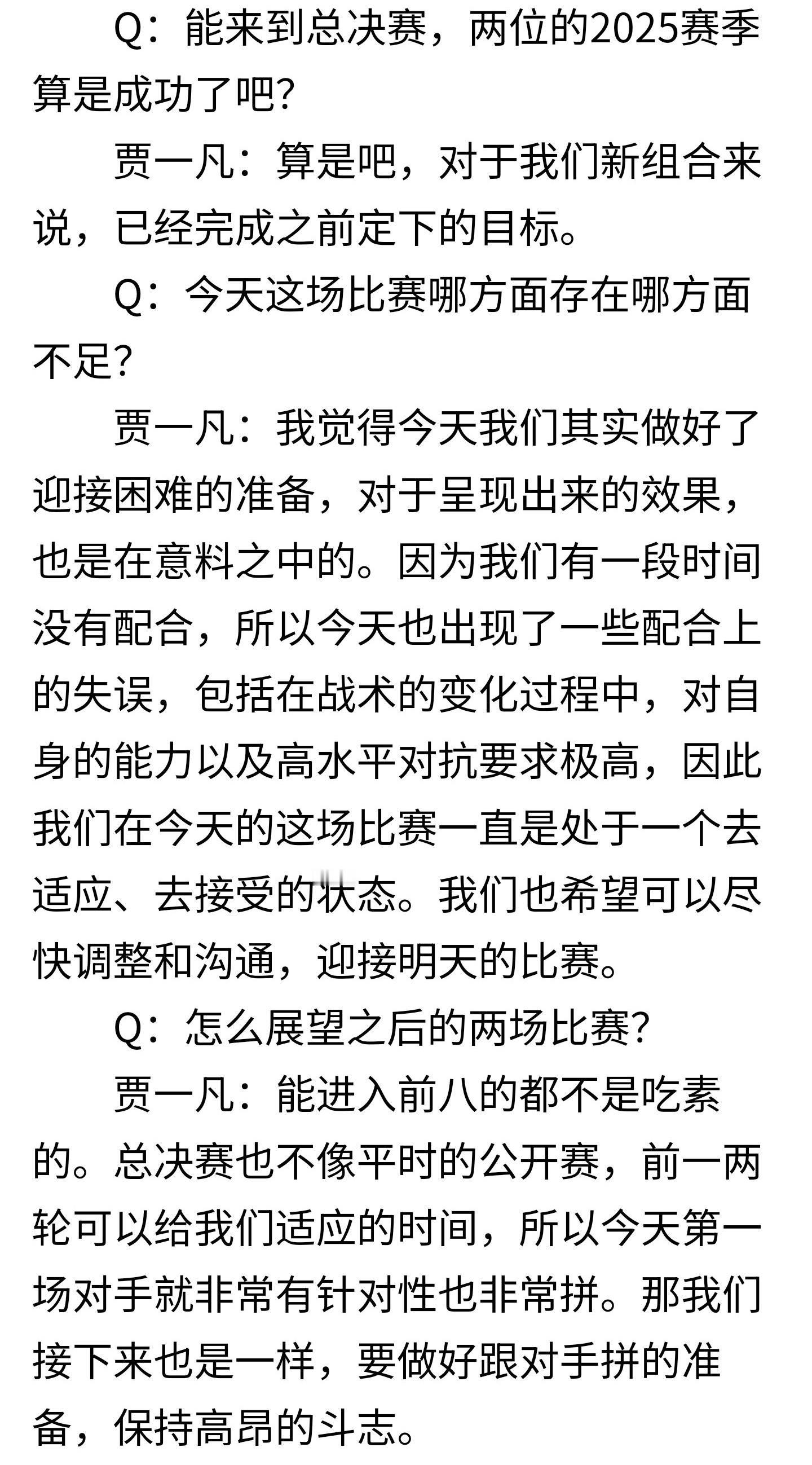 凡贤采访:有一段时间没配合了,争取小组出线Q:点评一下今天的发挥?贾一凡:我们在羽超联赛不在同一个队伍,首先肯定是要为各自的队伍效力,把比赛打好,再抽空一起配合,备战总决赛。但由于联赛的对抗水平没那么高,我们的训练质量肯定是不如在(国家)队里。对手她们一直在打国际比赛,今天一上来就是高水平的对抗,我们能感觉到无论是体能,战术,反应等都要慢半拍,确实今天有很多值得总结的地方。Q:两个人都是换了新的搭档参加总决赛,有什么不同的心态或感觉吗?张殊贤:没什么不一样,其实能参加总决赛就很开心,是对我们整个赛季的肯定。总决赛的每个对手都很强,所以要每场球都拿出最好的状态。贾一凡:我觉得我们还需要有更高的目标。之前我们的目标是参加总决赛,现在实现了,既然来了就要定下一个目标,那就是在场上的表现。比赛就是打出当下的状态和斗志,我们还有两场球,因为是小组赛赛制,还有容错空间,我们力争打好后两场球,争取小组出线。Q:能来到总决赛,两位的2025赛季算是成功了吧?贾一凡:算是吧,对于我们新组合来说,已经完成之前定下的目标。Q:今天这场比赛哪方面存在哪方面不足?贾一凡:我觉得今天我们其实做好了迎接困难的准备,对于呈现出来的效果,也是在意料之中的。因为我们有一段时间没有配合,所以今天也出现了一些配合上的失误,包括在战术的变化过程中,对自身的能力以及高水平对抗要求极高,因此我们在今天的这场比赛一直是处于一个去适应,去接受的状态。我们也希望可以尽快调整和沟通,迎接明天的比赛。Q:怎么展望之后的两场比赛?贾一凡:能进入前八的都不是吃素的。总决赛也不像平时的公开赛,前一两轮可以给我们适应的时间,所以今天第一场对手就非常有针对性也非常拼。那我们接下来也是一样,要做好跟对手拼的准备,保持高昂的斗志。2025年世界羽联年终总决赛