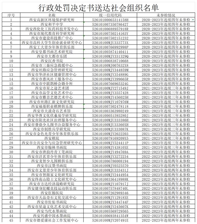 经查,西安高新区环境保护研究所等45家社会组织存在连续两个年度以上未接受年度检查的行为,违反了《民办非企业单位登记管理暂行条例》第二十三条第一款的规定。依据《民办非企业单位登记管理暂行条例》第二十五条第一款第(三)项的规定,适用陕西省民政部门行政处罚裁量权基准(2024版)(陕民规〔2024〕3号)中“连续2年在规定时间内未参加年检(年报)的”从重处罚情形,本机关现对以上社会组织作出“撤销登记”的行政处罚。