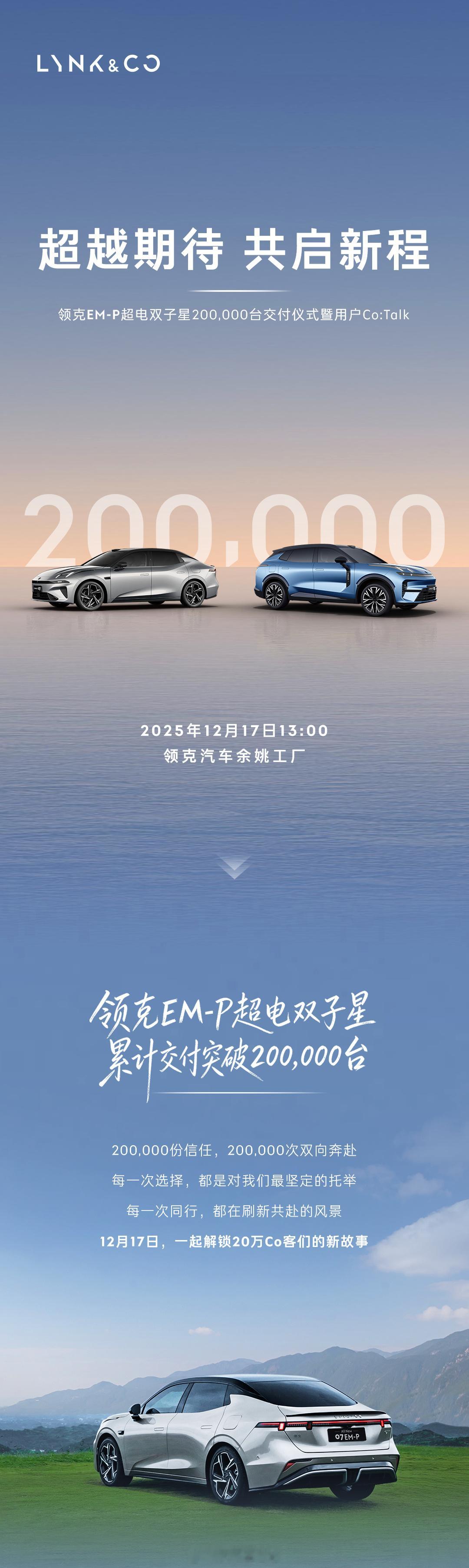 领克07 EM-P、领克08 EM-P 双子星累计交付超20万台。其中领克07